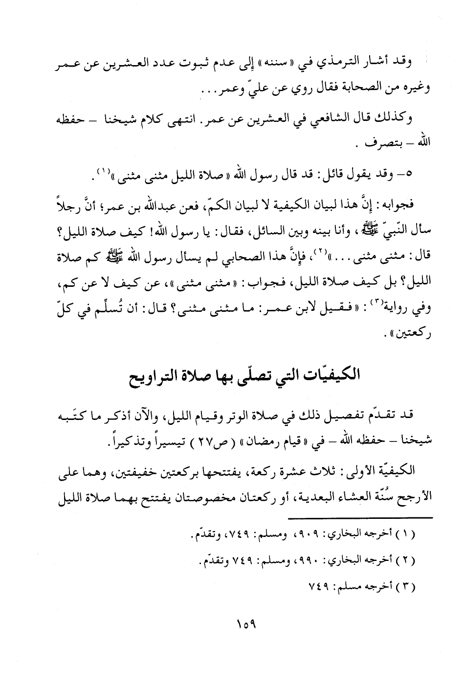 فجوابه: إِنَّ هذا لبيان الكيفية لا لبيان الكمّ، فعن عبد الله بن عمر؛ أنَّ رجلاً سأل النّبيّ - صَلَّى اللَّهُ عَلَيْهِ وَسَلَّمَ -، وأنا بينه وبين السائل، فقال: يا رسول الله! كيف صلاة الليل؛ قال: مثنى مثنى ... " (¬2)، فإِنَّ هذا الصحابي لم يسأل رسول الله - صَلَّى اللَّهُ عَلَيْهِ وَسَلَّمَ - كم صلاة الليل؛ بل كيف صلاة الليل، فجواب: "مثنى مثنى"، عن كيف لا عن كم، وفي رواية (¬3): "فقيل لابن عمر: ما مثنى مثنى؟ قال: أن تُسلِّم في كلّ ركعتين".