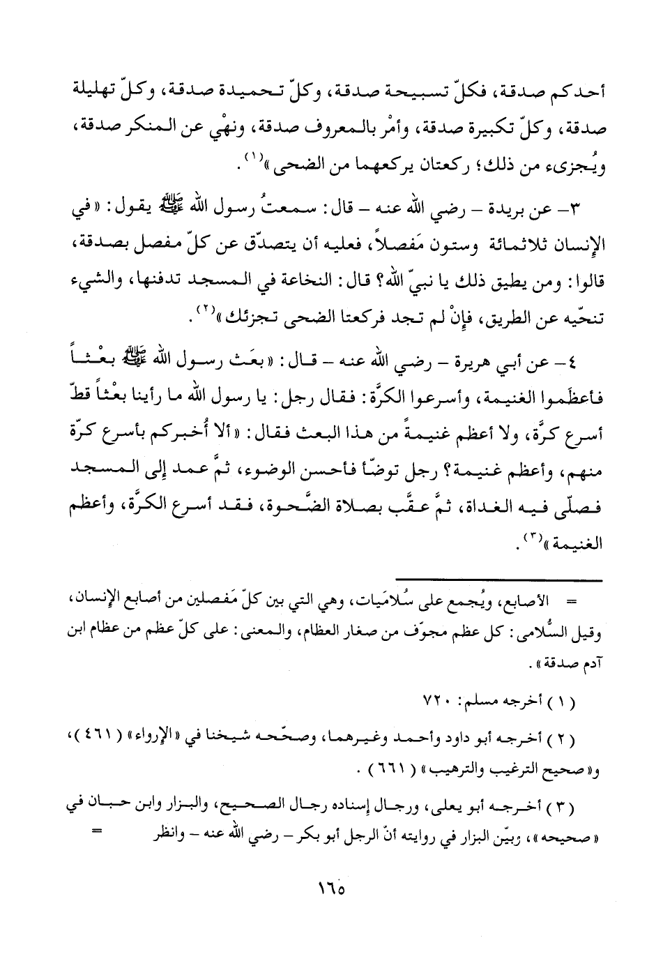 3 - عن بريدة -رضي الله عنه- قال: سمعتُ رسول الله - صَلَّى اللَّهُ عَلَيْهِ وَسَلَّمَ - يقول: "في الإِنسان ثلاثمائة وستون مَفصلاً، فعليه أن يتصدّق عن كلّ مفصل بصدقة، قالوا: ومن يطيق ذلك يا نبيّ الله؟ قال: النخاعة في المسجد تدفنها، والشيء تنحّيه عن الطريق، فإِنْ لم تجد فركعتا الضحى تجزئك" (¬2).