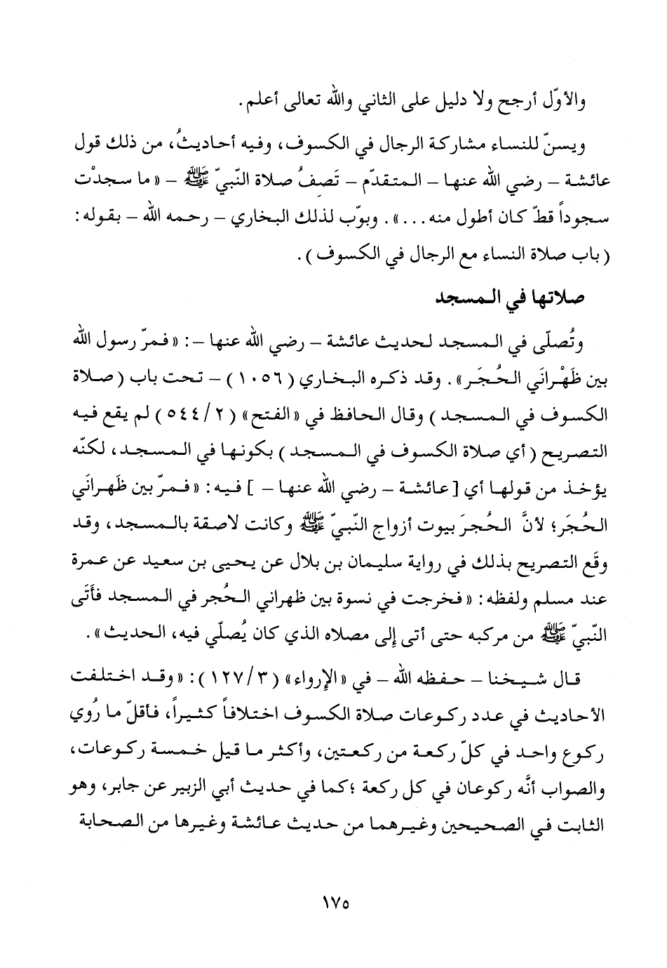 ويسنّ للنساء مشاركة الرجال في الكسوف، وفيه أحاديثُ، من ذلك قول عائشة -رضي الله عنها- المتقدّم- تَصِفُ صلاة النّبيّ - صَلَّى اللَّهُ عَلَيْهِ وَسَلَّمَ - "ما سجدْت سجوداً قطّ كان أطول منه ... ". وبوّب لذلك البخاري -رحمه الله بقوله: (باب صلاة النساء مع الرجال في الكسوف).