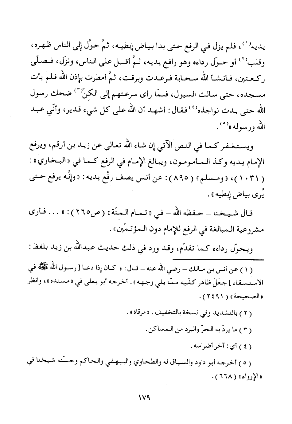 (¬1) عن أنس بن مالك -رضي الله عنه- قال: "كان إِذا دعا [رسول الله - صَلَّى اللَّهُ عَلَيْهِ وَسَلَّمَ - في الاستسقاء] جعَلَ ظاهر كفّيه ممّا يلي وجهه". أخرجه أبو يعلى في "مسنده"، وانظر "الصحيحة" (2491).