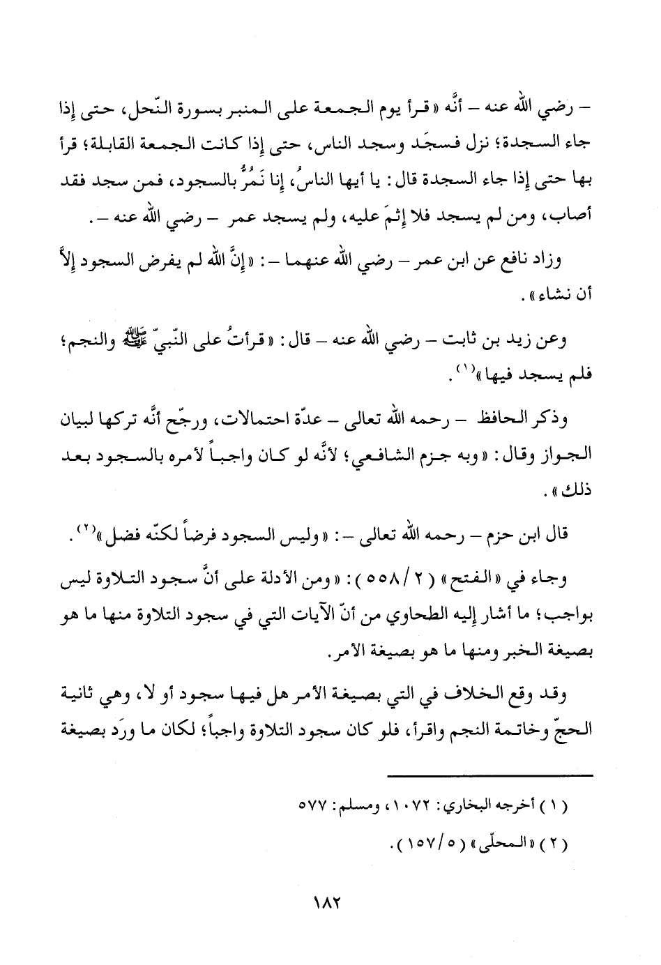 -رضي الله عنه- أنَّه "قرأ يوم الجمعة على المنبر بسورة النّحل، حتى إِذا جاء السجدة؛ نزل فسجَد وسجد الناس، حتى إِذا كانت الجمعة القابلة؛ قرأ بها حتى إِذا جاء السجدة قال: يا أيها الناسُ، إِنا نَمُرُّ بالسجود، فمن سجد فقد أصاب، ومن لم يسجد فلا إِثمَ عليه، ولم يسجد عمر -رضي الله عنه-.