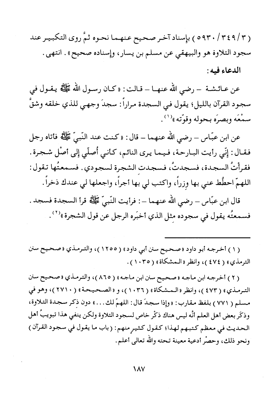 (¬2) أخرجه ابن ماجه "صحيح سنن ابن ماجه" (865)، والترمذي "صحيح سنن الترمذي" (473)، وانظر "المشكاة" (1036)، و"الصحيحة" (2710)، وهو في مسلم (771) بلفظ مقارب: "وإذا سجدَ قال: اللهمّ لك ... " دون ذِكر سجدة التلاوة، وذكَر بعض أهل العلم أنَّه ليس هناك ذكْر خاص لسجود التلاوة ولكن ينفي هذا تبويبُ أهل الحديث في معظم كتبهم لهذا؛ كقول كثيرٍ منهم: (باب ما يقول في سجود القرآن) ونحو ذلك، وحصْر أدعية معينة تحته والله تعالى أعلم.