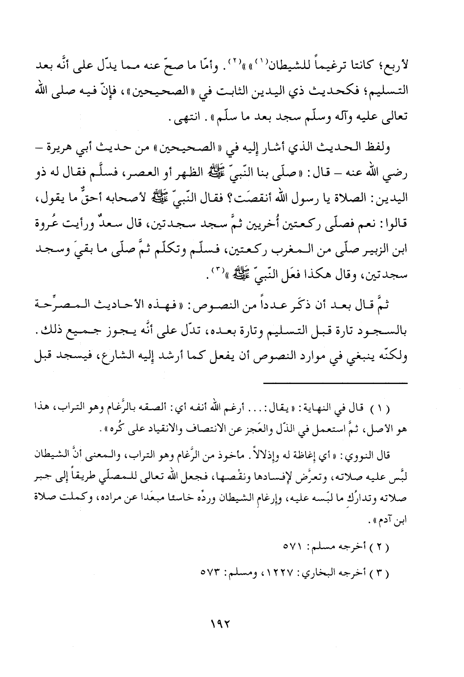 ولفظ الحديث الذي أشار إِليه في "الصحيحين" من حديث أبي هريرة - رضي الله عنه- قال: "صلّى بنا النّبيّ - صَلَّى اللَّهُ عَلَيْهِ وَسَلَّمَ - الظهر أو العصر، فسلَّم فقال له ذو اليدين: الصلاة يا رسول الله أنقصَت؟ فقال النّبيّ - صَلَّى اللَّهُ عَلَيْهِ وَسَلَّمَ - لأصحابه أحقٌ ما يقول، قالوا: نعم فصلّى ركعتين أُخريين ثمَّ سجد سجدتين، قال سعدٌ ورأيت عُروة ابن الزبير صلّى من المغرب ركعتين، فسلّم وتكلّم ثمَّ صلّى ما بقيَ وسجد سجدتين، وقال هكذا فعَل النّبيّ - صَلَّى اللَّهُ عَلَيْهِ وَسَلَّمَ -" (¬3).