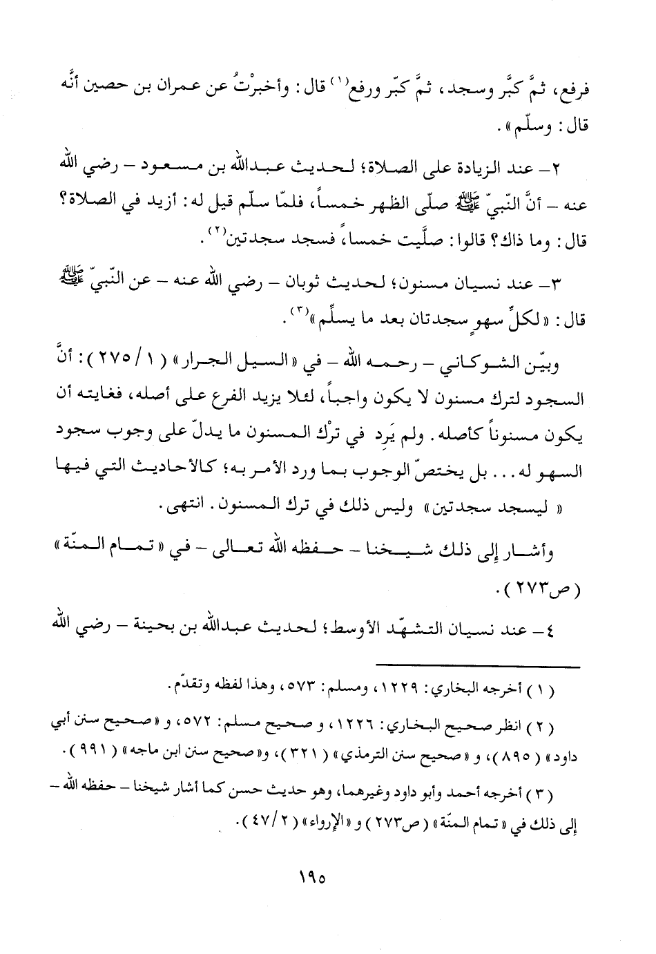 وبيّن الشوكاني -رحمه الله- في "السيل الجرار" (1/ 275): أنَّ السجود لترك مسنون لا يكون واجباً، لئلا يزيد الفرع على أصله، فغايته أن يكون مسنوناً كأصله. ولم يَرِد في ترْك المسنون ما يدلّ على وجوب سجود السهو له ... بل يختصّ الوجوب بما ورد الأمر به؛ كالأحاديث التي فيها "ليسجد سجدتين" وليس ذلك في ترك المسنون. انتهى.