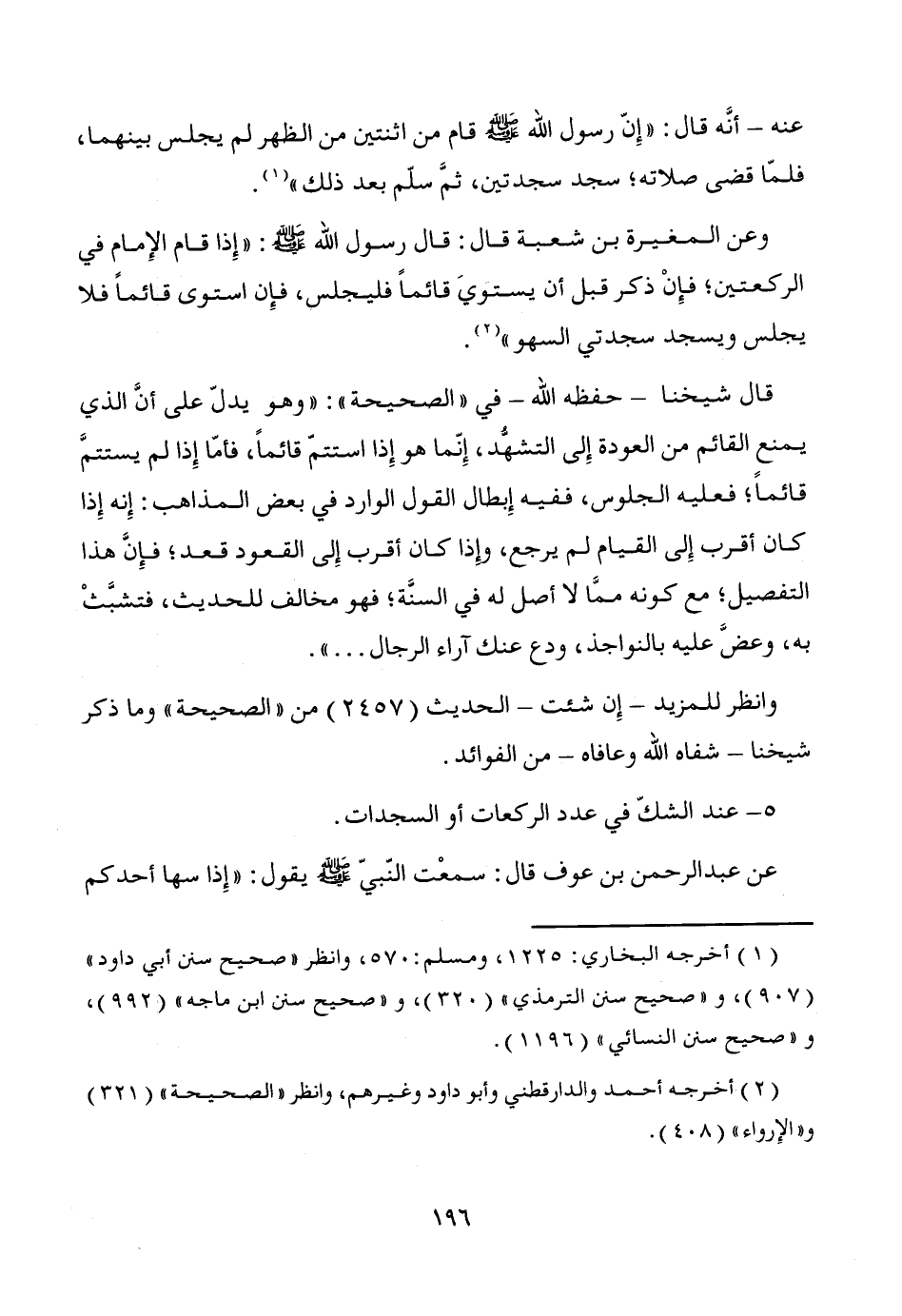 قال شيخنا -حفظه الله- في "الصحيحة": "وهو يدلّ على أنَّ الذي يمنع القائم من العودة إِلى التشهُّد، إِنّما هو إِذا استتمّ قائماً، فأمّا إِذا لم يستتمَّ قائماً؛ فعليه الجلوس، ففيه إِبطال القول الوارد في بعض المذاهب: إِنه إِذا كان أقرب إِلى القيام لم يرجع، وإذا كان أقرب إِلى القعود قعد؛ فإِنَّ هذا التفصيل؛ مع كونه ممَّا لا أصل له في السنَّة؛ فهو مخالف للحديث، فتشبَّثْ به، وعضَّ عليه بالنواجذ، ودع عنك آراء الرجال ... ".