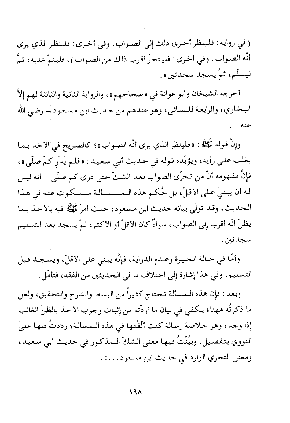 وبعد: فإِن هذه المسألة تحتاج كثيراً من البسط والشرح والتحقيق، ولعل ما ذكرتُه هاهنا؛ يكفي في بيان ما أردْته من إِثبات وجوب الأخذ بالظنّ الغالب إِذا وجد، وهو خلاصة رسالة كنت ألّفْتها في هذه المسألة؛ رددتُ فيها على النووي بتفصيل، وبيَّنتُ فيها معنى الشكّ المذكور في حديث أبي سعيد، ومعنى التحري الوارد في حديث ابن مسعود ... ".