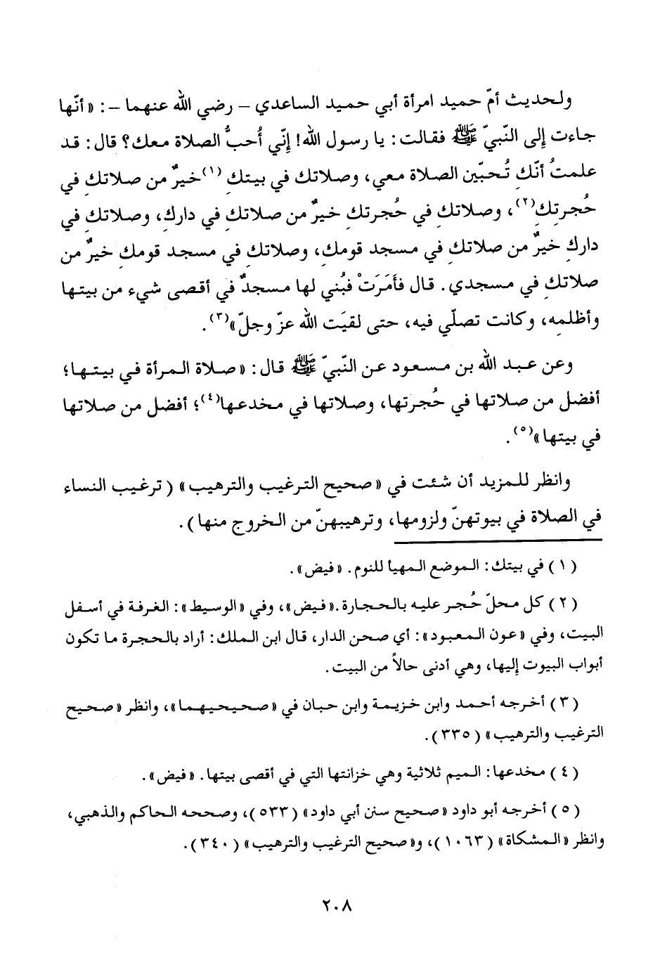 وعن عبد الله بن مسعود عن النّبيّ - صَلَّى اللَّهُ عَلَيْهِ وَسَلَّمَ - قال: "صلاة المرأة في بيتها؛ أفضل من صلاتها في حُجرتها، وصلاتها في مخدعها (¬4)؛ أفضل من صلاتها في بيتها" (¬5).