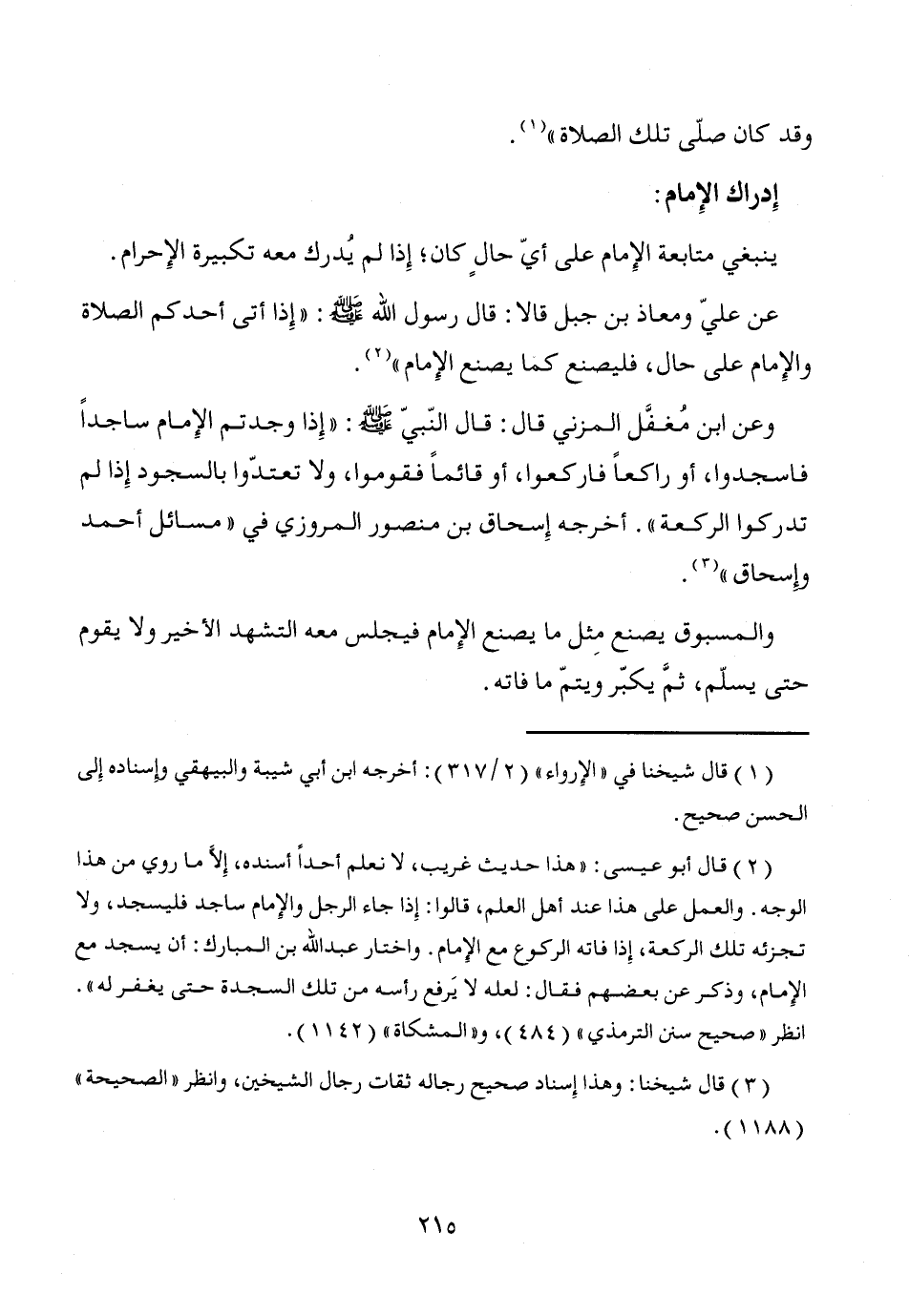 عن عليّ ومعاذ بن جبل قالا: قال رسول الله - صَلَّى اللَّهُ عَلَيْهِ وَسَلَّمَ -: "إِذا أتى أحدكم الصلاة والإِمام على حال، فليصنع كما يصنع الإِمام" (¬2).