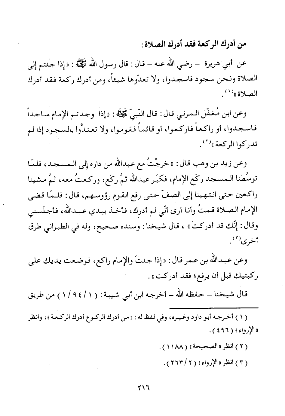 وعن زيد بن وهب قال: "خرجْتُ مع عبد الله من داره إِلى المسجد، فلمّا توسَّطنا المسجد ركَع الإِمام، فكبّر عبد الله ثمَّ ركَع، وركعتُ معه، ثمَّ مشينا راكعين حتى انتهينا إِلى الصفّ حتى رفع القوم رؤوسهم، قال: فلمّا قضى الإِمام الصلاة قمتُ وأنا أرى أنّي لم أدرِك، فأخذ بيدي عبد الله، فأجلَسني وقال: إِنّك قد أدركتَ"، قال شيخنا: وسنده صحيح، وله في الطبراني طرق أخرى (¬3).