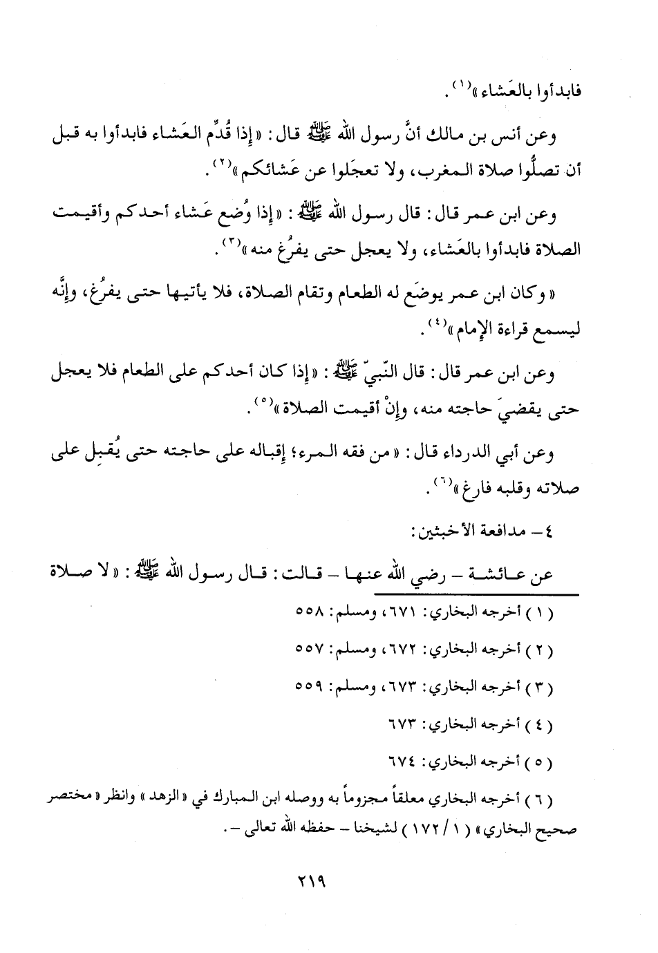 وعن أنس بن مالك أنَّ رسول الله - صَلَّى اللَّهُ عَلَيْهِ وَسَلَّمَ - قال: "إِذا قُدِّم العَشاء فابدأوا به قبل أن تصلُّوا صلاة المغرب، ولا تعجَلوا عن عَشائكم" (¬2).