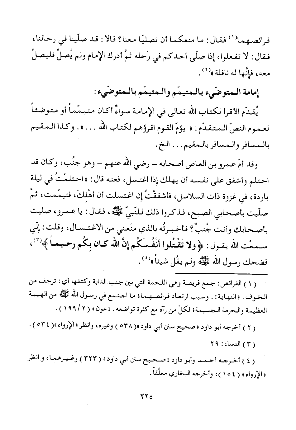 وقد أمّ عمرو بن العاص أصحابه -رضي الله عنهم- وهو جنُب، وكان قد احتلم وأشفق على نفسه أن يهلك إِذا اغتسل، فعنه قال: "احتلمْتُ في ليلة باردة، في غزوة ذات السلاسل، فأشفقْتُ إِن اغتسلت أن أهْلِكَ، فتيمّمت، ثمَّ صلّيت بأصحابي الصبح، فذكروا ذلك للنّبيّ - صَلَّى اللَّهُ عَلَيْهِ وَسَلَّمَ -، فقال: يا عمرو، صليت بأصحابك وأنت جُنبٌ؟ فأخبرتُه بالذي منَعني من الاغتسال، وقلت: إِني سمعْت الله يقول: {ولا تَقْتُلوا أنْفُسَكُم إِنَّ الله كان بِكُم رحيماً} (¬3)، فضحك رسول الله - صَلَّى اللَّهُ عَلَيْهِ وَسَلَّمَ - ولم يقُل شيئاً" (¬4).
