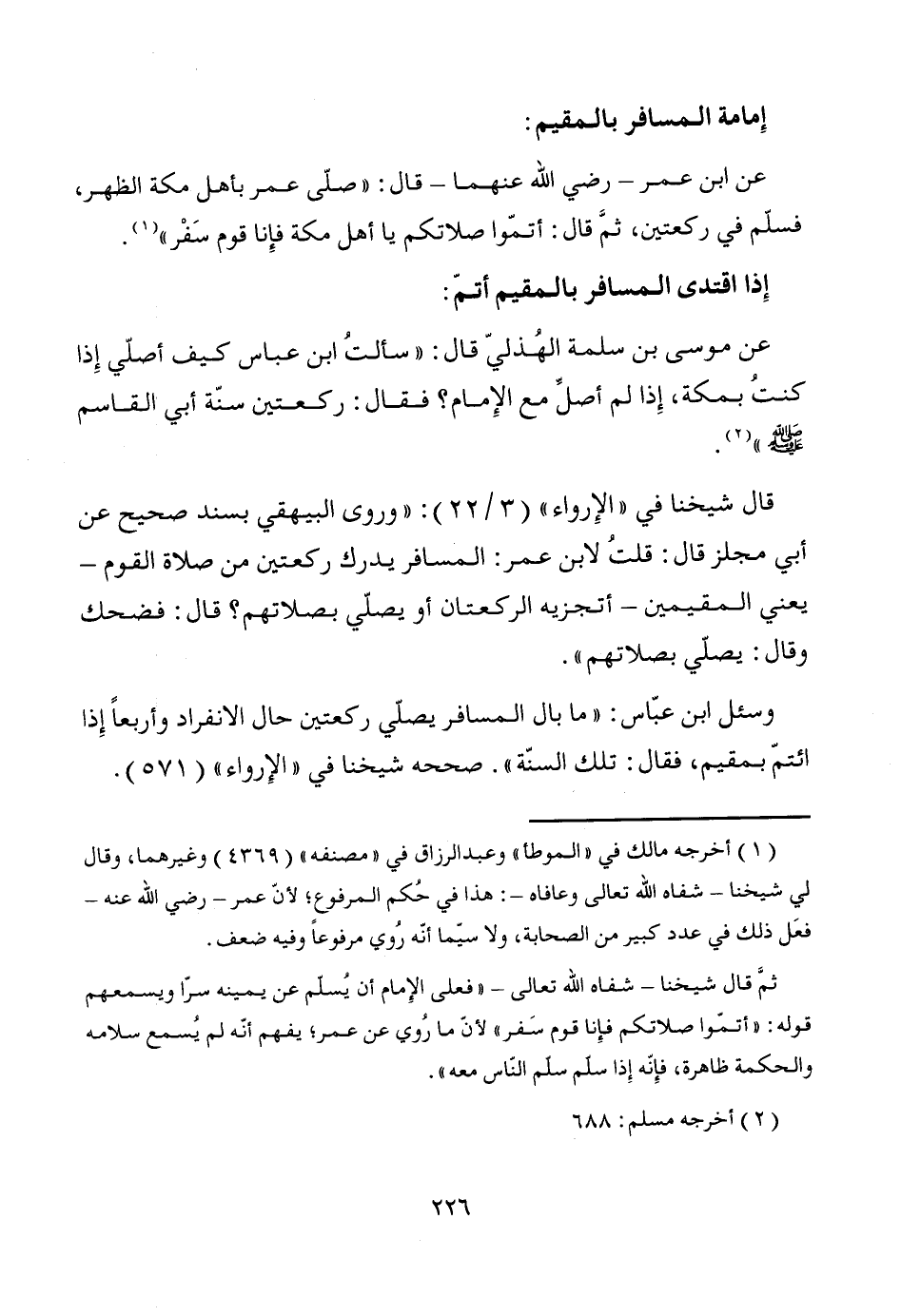 وسئل ابن عبّاس: "ما بال المسافر يصلّي ركعتين حال الانفراد وأربعاً إِذا ائتمّ بمقيم، فقال: تلك السنّة". صححه شيخنا في "الإِرواء" (571).
