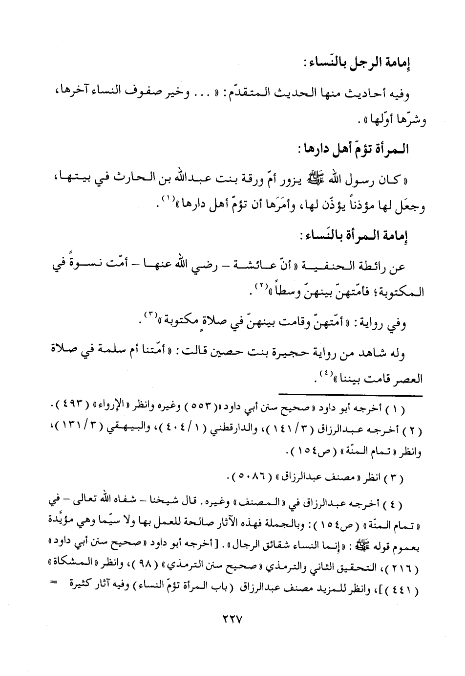 (¬4) أخرجه عبد الرزاق في "المصنف" وغيره. قال شيخنا -شفاه الله تعالى- في "تمام المنة" (ص154): وبالجملة فهذه الآثار صالحة للعمل بها ولا سيما وهي مؤيَّدة بعموم قوله - صَلَّى اللَّهُ عَلَيْهِ وَسَلَّمَ -: "إنما النساء شقائق الرجال". [أخرجه أبو داود "صحيح سنن أبي داود" (216)، التحقيق الثاني والترمذي "صحيح سنن الترمذي" (98)، وانظر "المشكاة" (441)]، وانظر للمزيد مصنف عبد الرزاق (باب المرأة تؤمّ النساء) وفيه آثار كثيرة =