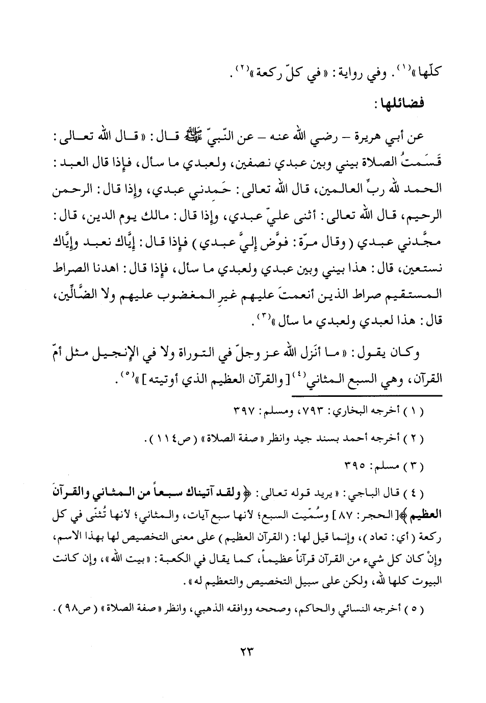 عن أبي هريرة -رضي الله عنه- عن النّبيّ - صَلَّى اللَّهُ عَلَيْهِ وَسَلَّمَ - قال: "قال الله تعالى: قَسَمتُ الصلاة بيني وبين عبدي نصفين، ولعبدي ما سأل، فإِذا قال العبد: الحمد لله ربِّ العالمين، قال الله تعالى: حَمِدني عبدي، وإِذا قال: الرحمن الرحيم، قال الله تعالى: أثنى عليّ عبدي، وإذا قال: مالك يوم الدين، قال: مجَّدني عبدي (وقال مرّة: فوَّض إِليَّ عبدي) فإِذا قال: إِيَّاك نعبد وإياك نستعين، قال: هذا بيني وبين عبدي ولعبدي ما سأل، فإِذا قال: اهدنا الصراط المستقيم صراط الذين أنعمتَ عليهم غيرِ المغضوب عليهم ولا الضَّالِّين، قال: هذا لعبدي ولعبدي ما سأل" (¬3).