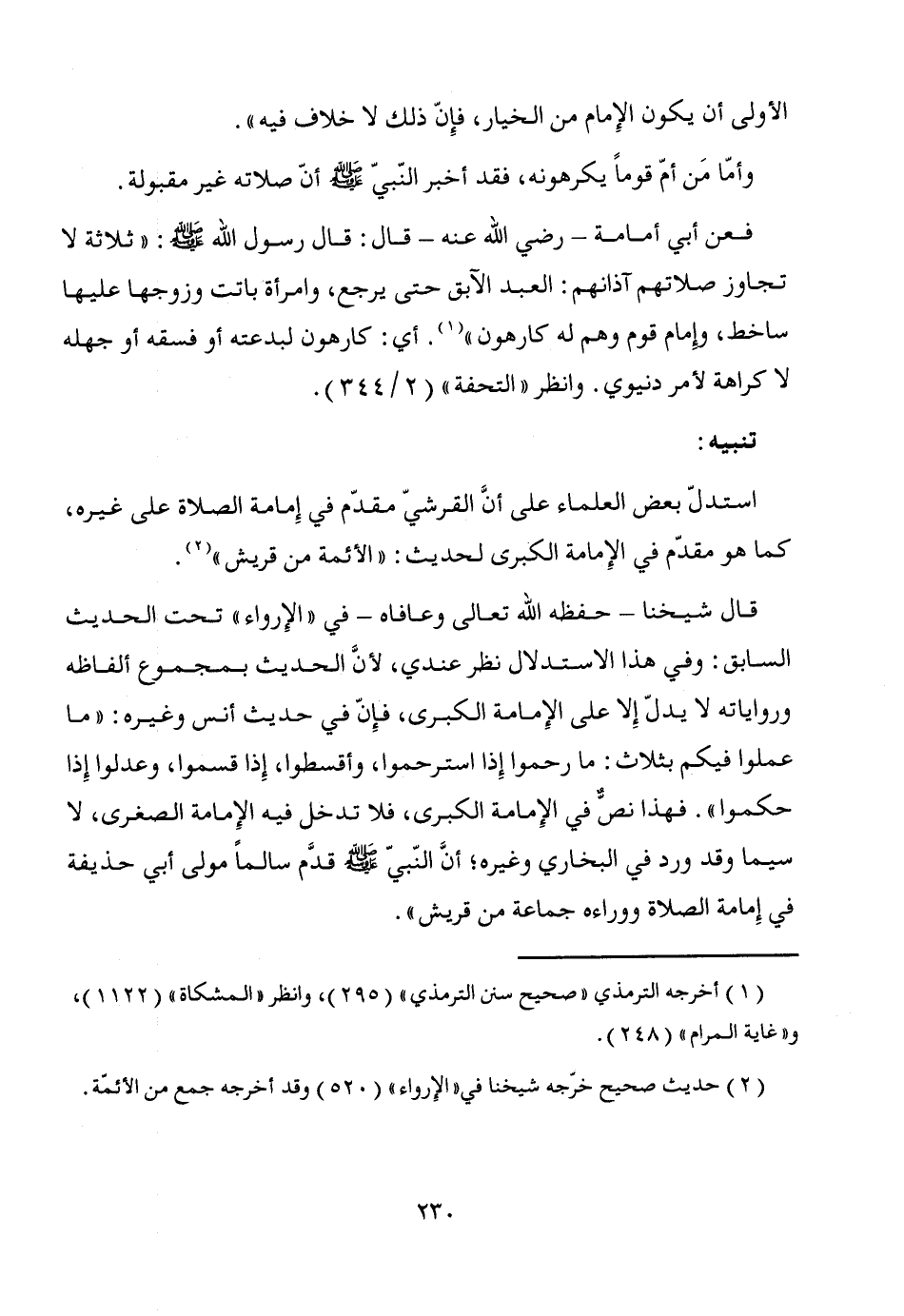 قال شيخنا -حفظه الله تعالى وعافاه- في "الإِرواء" تحت الحديث السابق: وفي هذا الاستدلال نظر عندي، لأنَّ الحديث بمجموع ألفاظه ورواياته لا يدلّ إِلا على الإِمامة الكبرى، فإِنّ في حديث أنس وغيره: "ما عملوا فيكم بثلاث: ما رحموا إِذا استرحموا، وأقسطوا، إِذا قسموا، وعدلوا إِذا حكموا". فهذا نصٌّ في الإِمامة الكبرى، فلا تدخل فيه الإِمامة الصغرى، لا سيما وقد ورد في البخاري وغيره؛ أنَّ النّبيّ - صَلَّى اللَّهُ عَلَيْهِ وَسَلَّمَ - قدَّم سالماً مولى أبي حذيفة في إِمامة الصلاة ووراءه جماعة من قريش".