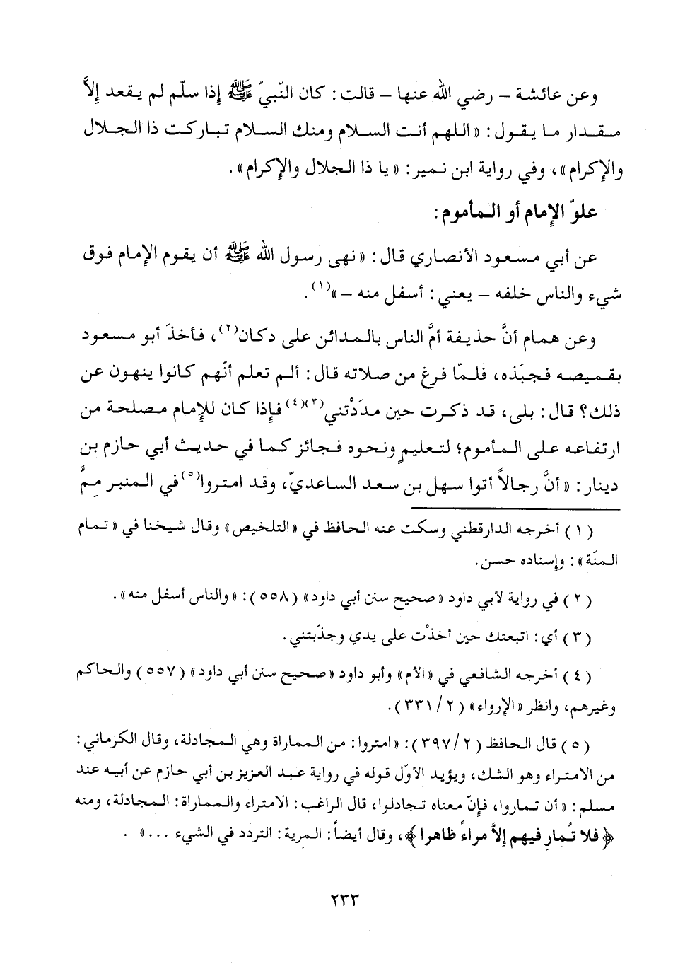 وعن عائشة -رضي الله عنها- قالت: كان النّبيّ - صَلَّى اللَّهُ عَلَيْهِ وَسَلَّمَ - إِذا سلّم لم يقعد إلاَّ مقدار ما يقول: "اللهم أنت السلام ومنك السلام تباركت ذا الجلال والإِكرام"، وفي رواية ابن نمير: "يا ذا الجلال والإِكرام".