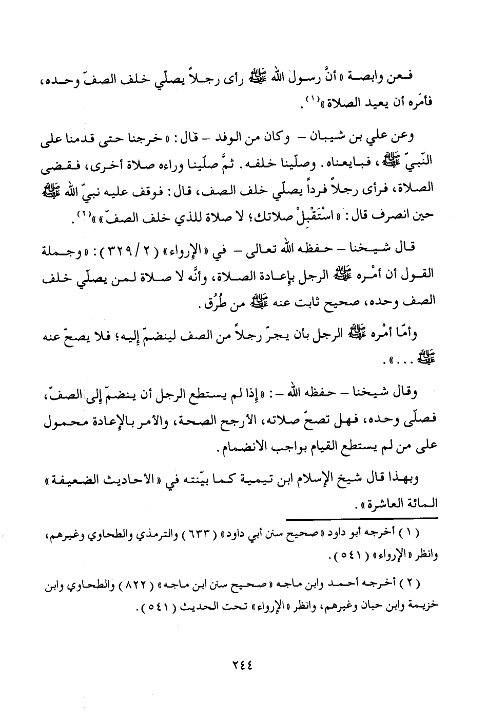 وعن علي بن شيبان -وكان من الوفد- قال: "خرجنا حتى قدمنا على النّبيّ - صَلَّى اللَّهُ عَلَيْهِ وَسَلَّمَ -، فبايعناه. وصلّينا خلفه. ثمَّ صلينا وراءه صلاة أخرى، فقضى الصلاة، فرأى رجلاً فرداً يصلّي خلف الصف، قال: فوقف عليه نبيّ الله - صَلَّى اللَّهُ عَلَيْهِ وَسَلَّمَ - حين انصرف قال: "اسْتَقْبِلْ صلاتك؛ لا صلاة للذي خلف الصفّ"" (¬2).