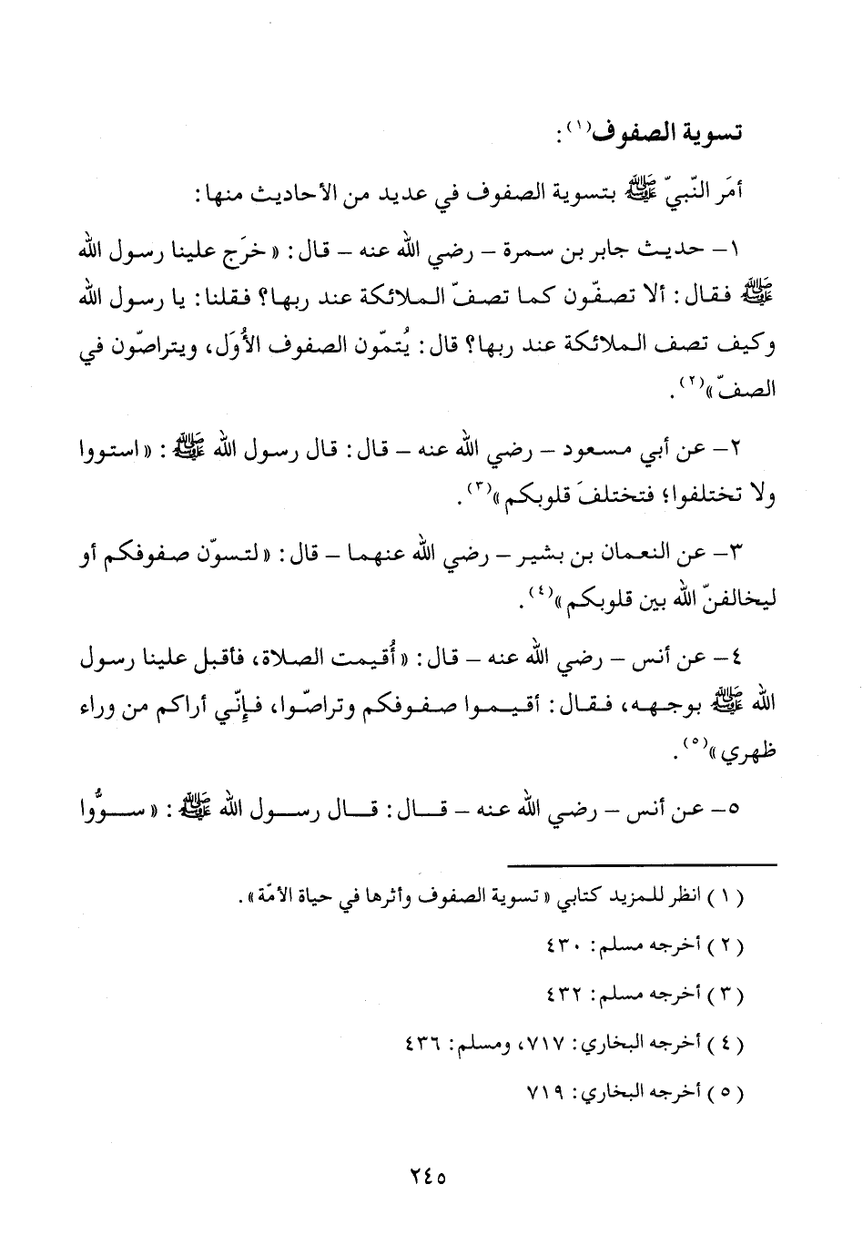 1 - حديث جابر بن سمرة -رضي الله عنه- قال: "خرَج علينا رسول الله - صَلَّى اللَّهُ عَلَيْهِ وَسَلَّمَ - فقال: ألا تصفّون كما تصفّ الملائكة عند ربها؟ فقلنا: يا رسول الله وكيف تصف الملائكة عند ربها؟ قال: يُتمّون الصفوف الأُوَل، ويتراصّون في الصف" (¬2).