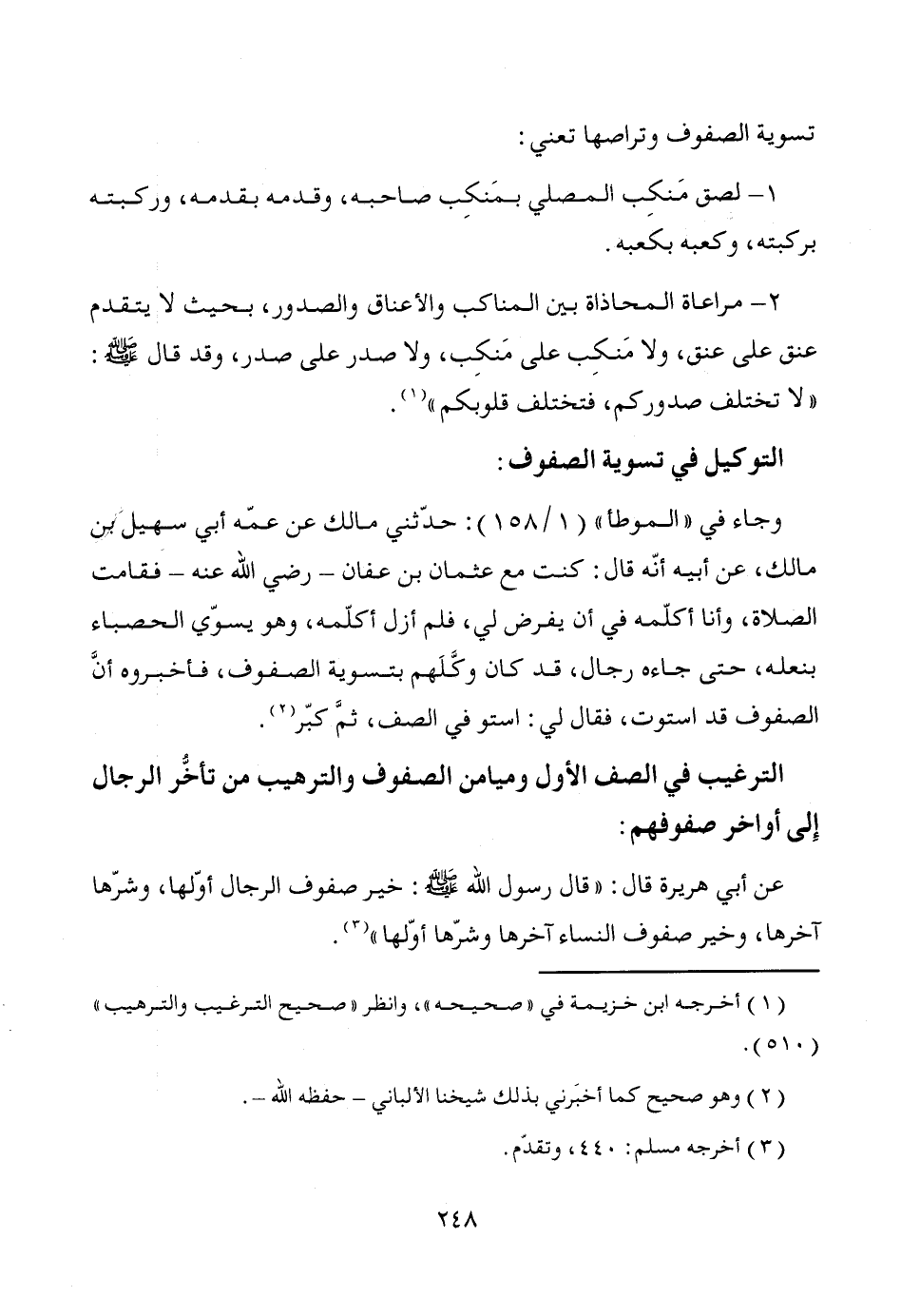 1 - لصق مَنكِب المصلي بمَنكِب صاحبه، وقدمه بقدمه، وركبته بركبته، وكعبه بكعبه.