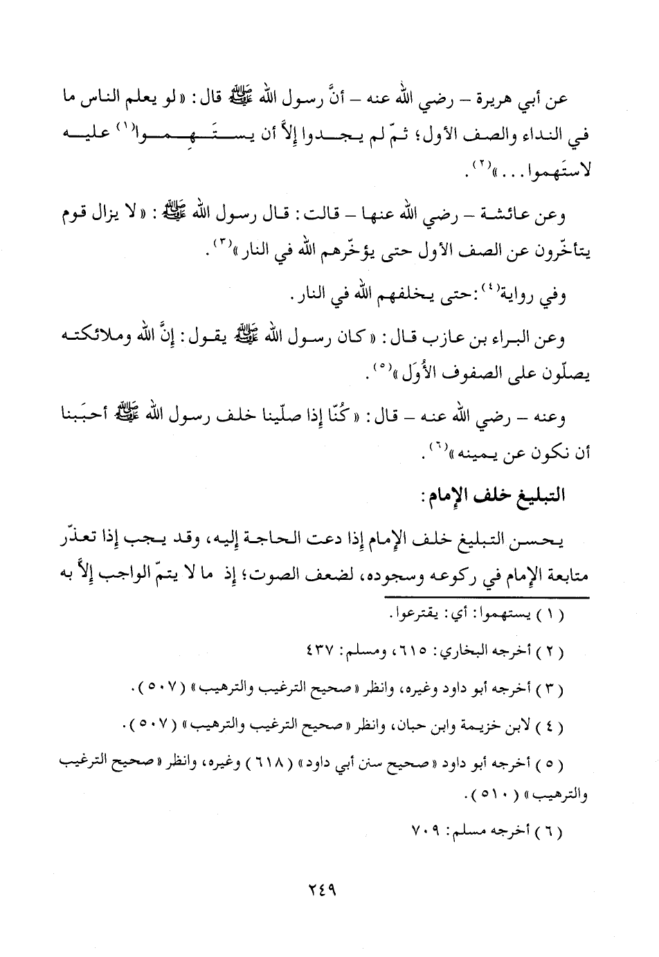 وعن البراء بن عازب قال: "كان رسول الله - صَلَّى اللَّهُ عَلَيْهِ وَسَلَّمَ - يقول: إِنَّ الله وملائكته يصلّون على الصفوف الأُوَل" (¬5).