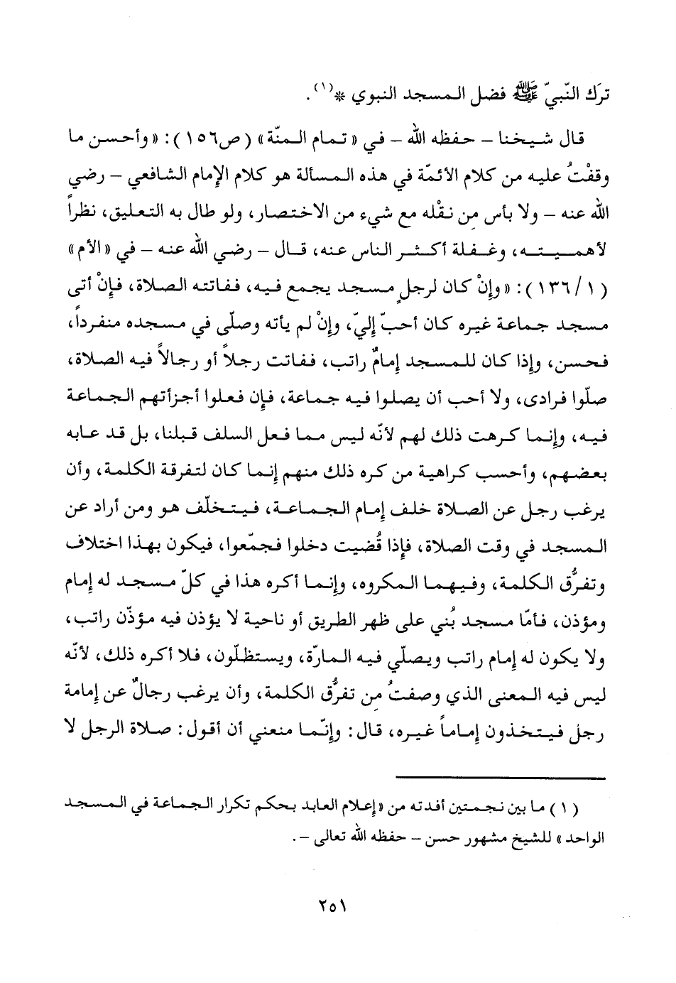 قال شيخنا -حفظه الله- في "تمام المنّة" (ص 156): "وأحسن ما وقفْتُ عليه من كلام الأئمّة في هذه المسألة هو كلام الإِمام الشافعي -رضي الله عنه- ولا بأس مِن نقْله مع شيء من الاختصار، ولو طال به التعليق، نظراً لأهميته، وغفلة أكثر الناس عنه، قال -رضي الله عنه- في "الأم" (1/ 136): "وإِنْ كان لرجلٍ مسجد يجمع فيه، ففاتته الصلاة، فإِنْ أتى مسجد جماعة غيره كان أحبّ إِليّ، وإِنْ لم يأته وصلّى في مسجده منفرداً، فحسن، وإذا كان للمسجد إِمامٌ راتب، ففاتت رجلاً أو رجالاً فيه الصلاة، صلّوا فرادى، ولا أحب أن يصلوا فيه جماعة، فإِن فعلوا أجزأتهم الجماعة فيه، وإِنما كرهت ذلك لهم لأنّه ليس مما فعل السلف قبلنا، بل قد عابه بعضهم، وأحسب كراهية من كره ذلك منهم إِنما كان لتفرقة الكلمة، وأن يرغب رجل عن الصلاة خلف إِمام الجماعة، فيتخلّف هو ومن أراد عن المسجد في وقت الصلاة، فإِذا قُضيت دخلوا فجمّعوا، فيكون بهذا اختلاف وتفرُّق الكلمة، وفيهما المكروه، وإِنما أكره هذا في كلّ مسجد له إِمام ومؤذن، فأمّا مسجد بُني على ظهر الطريق أو ناحية لا يؤذن فيه مؤذّن راتب، ولا يكون له إِمام راتب ويصلّي فيه المارّة، ويستظلّون، فلا أكره ذلك، لأنّه ليس فيه المعنى الذي وصفتُ مِن تفرُّق الكلمة، وأن يرغب رجالٌ عن إِمامة رجل فيتخذون إِماماً غيره، قال: وإنّما معني أن أقول: صلاة الرجل لا
