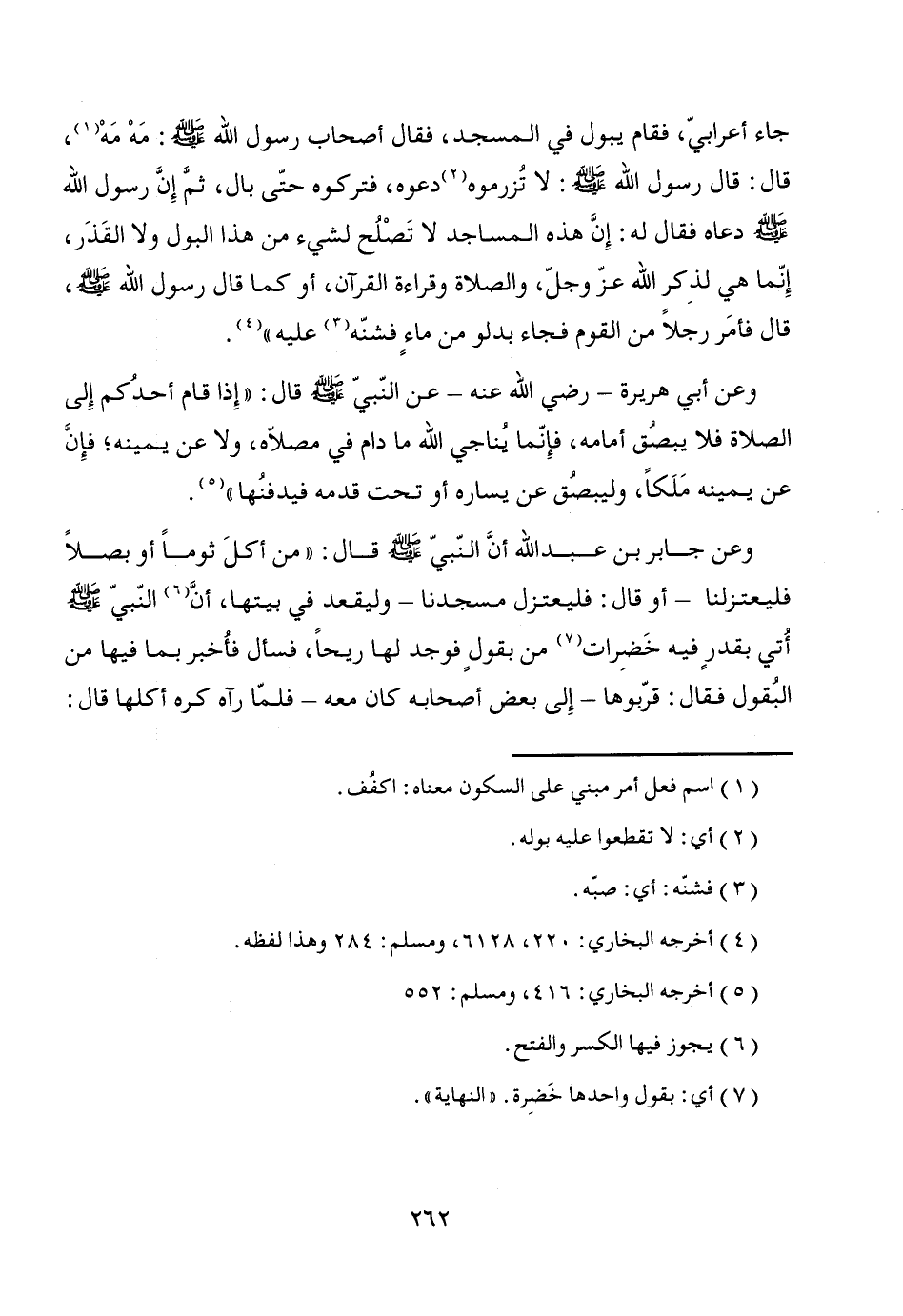 جاء أعرابيّ، فقام يبول في المسجد، فقال أصحاب رسول الله - صَلَّى اللَّهُ عَلَيْهِ وَسَلَّمَ -: مَهْ مَهْ (¬1)، قال: قال رسول الله - صَلَّى اللَّهُ عَلَيْهِ وَسَلَّمَ -: لا تُزرموه (¬2) دعوه، فتركوه حتّى بال، ثمَّ إِنَّ رسول الله - صَلَّى اللَّهُ عَلَيْهِ وَسَلَّمَ - دعاه فقال له: إِنَّ هذه المساجد لا تَصْلُح لشيء من هذا البول ولا القَذَر، إِنّما هي لذِكر الله عزّ وجلّ، والصلاة وقراءة القرآن، أو كما قال رسول الله - صَلَّى اللَّهُ عَلَيْهِ وَسَلَّمَ -، قال فأمَر رجلاً من القوم فجاء بدلو من ماءٍ فشنّه (¬3) عليه" (¬4).