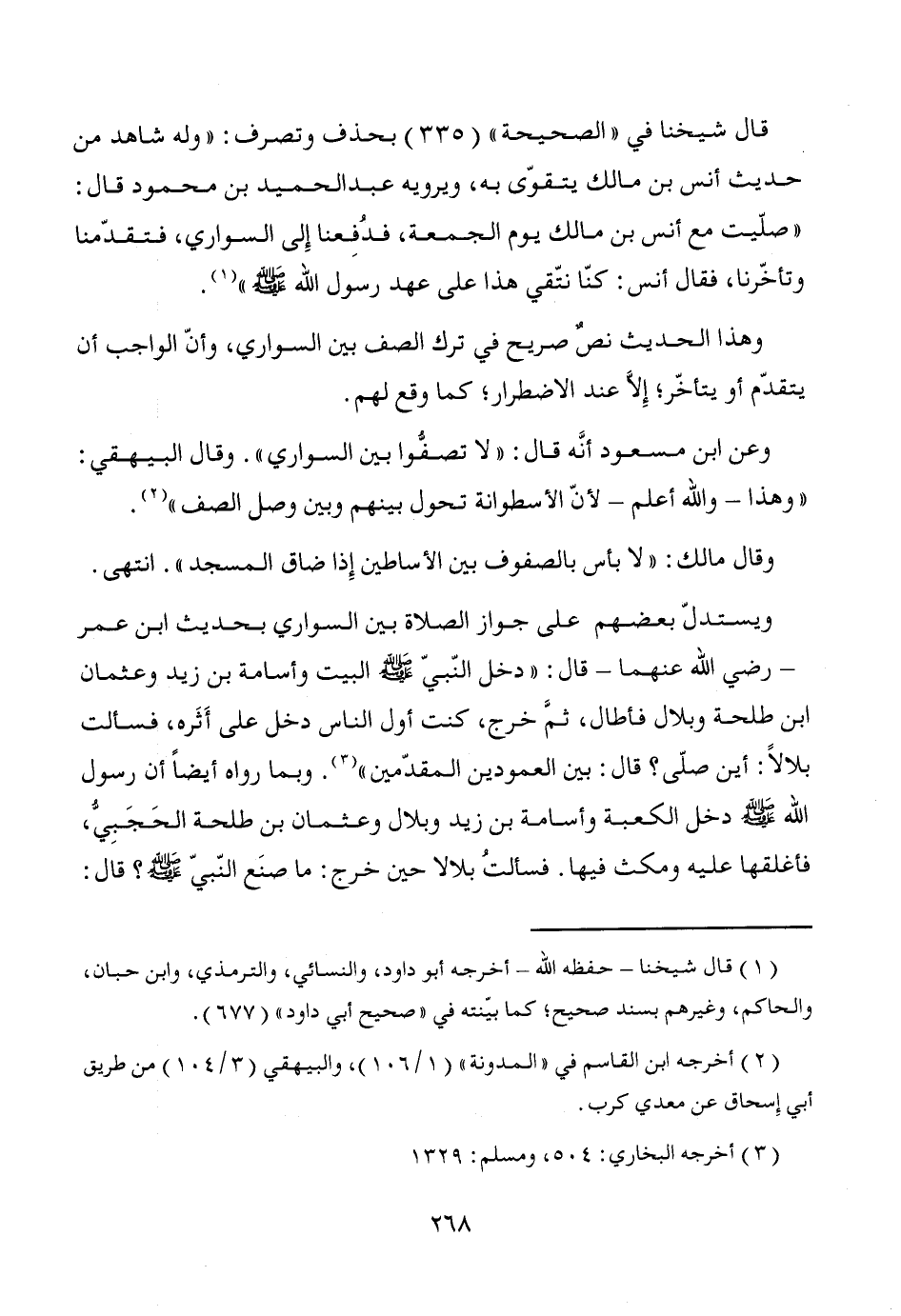 وهذا الحديث نصٌّ صريح في ترك الصف بين السواري، وأنّ الواجب أن يتقدّم أو يتأخّر؛ إلاَّ عند الاضطرار؛ كما وقع لهم.