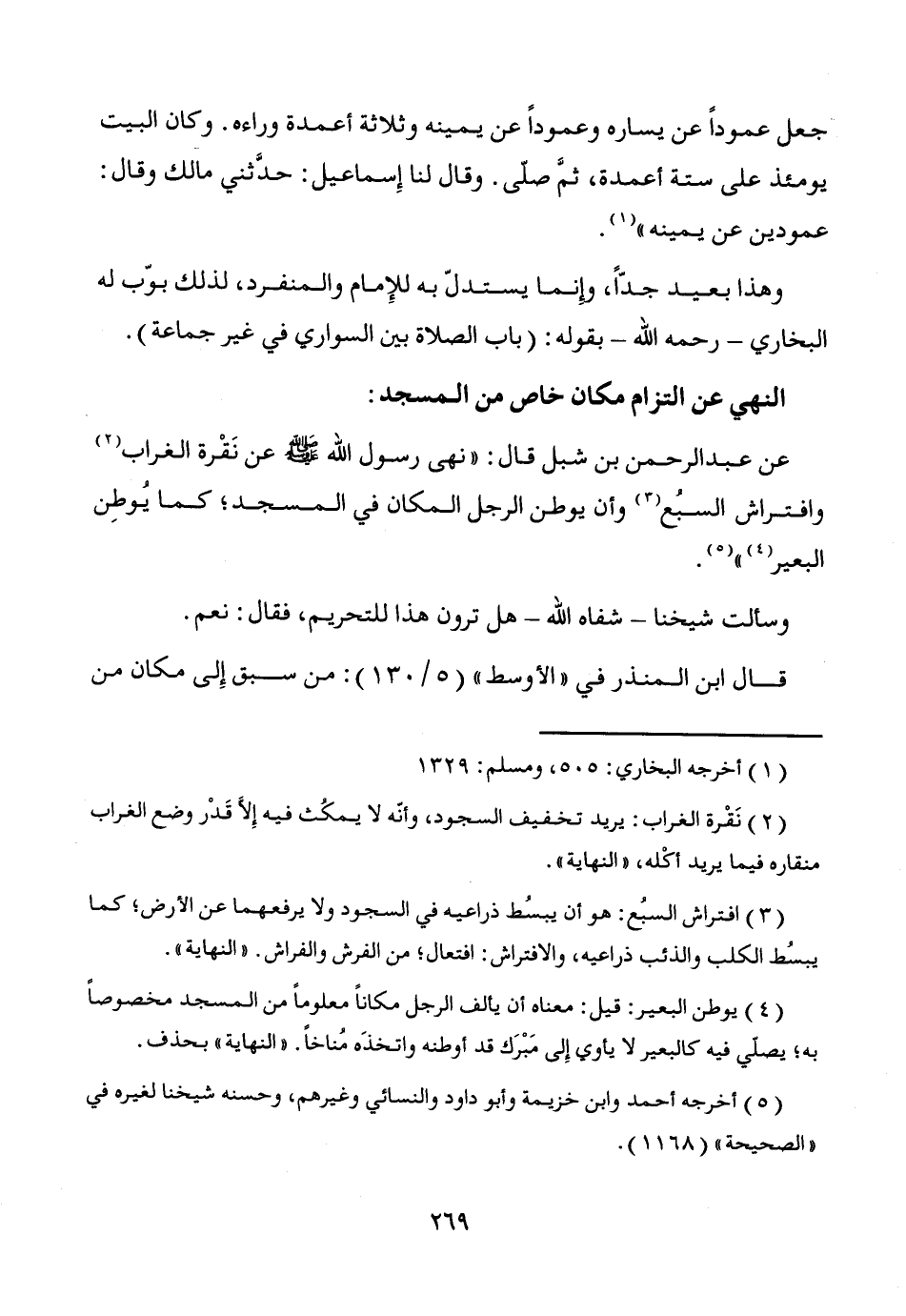 عن عبد الرحمن بن شبل قال: "نهى رسول الله - صَلَّى اللَّهُ عَلَيْهِ وَسَلَّمَ - عن نَقْرة الغراب (¬2) وافتراش السبُع (¬3) وأن يوطن الرجل المكان في المسجد، كما يُوطِن البعير (¬4) " (¬5).