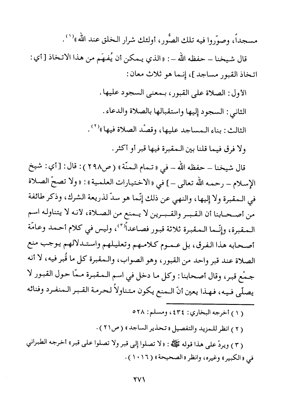 قال شيخنا -حفظه الله-: "الذي يمكن أن يُفهَم من هذا الاتخاذ [أي: اتخاذ القبور مساجد]، إِنما هو ثلاث معان: