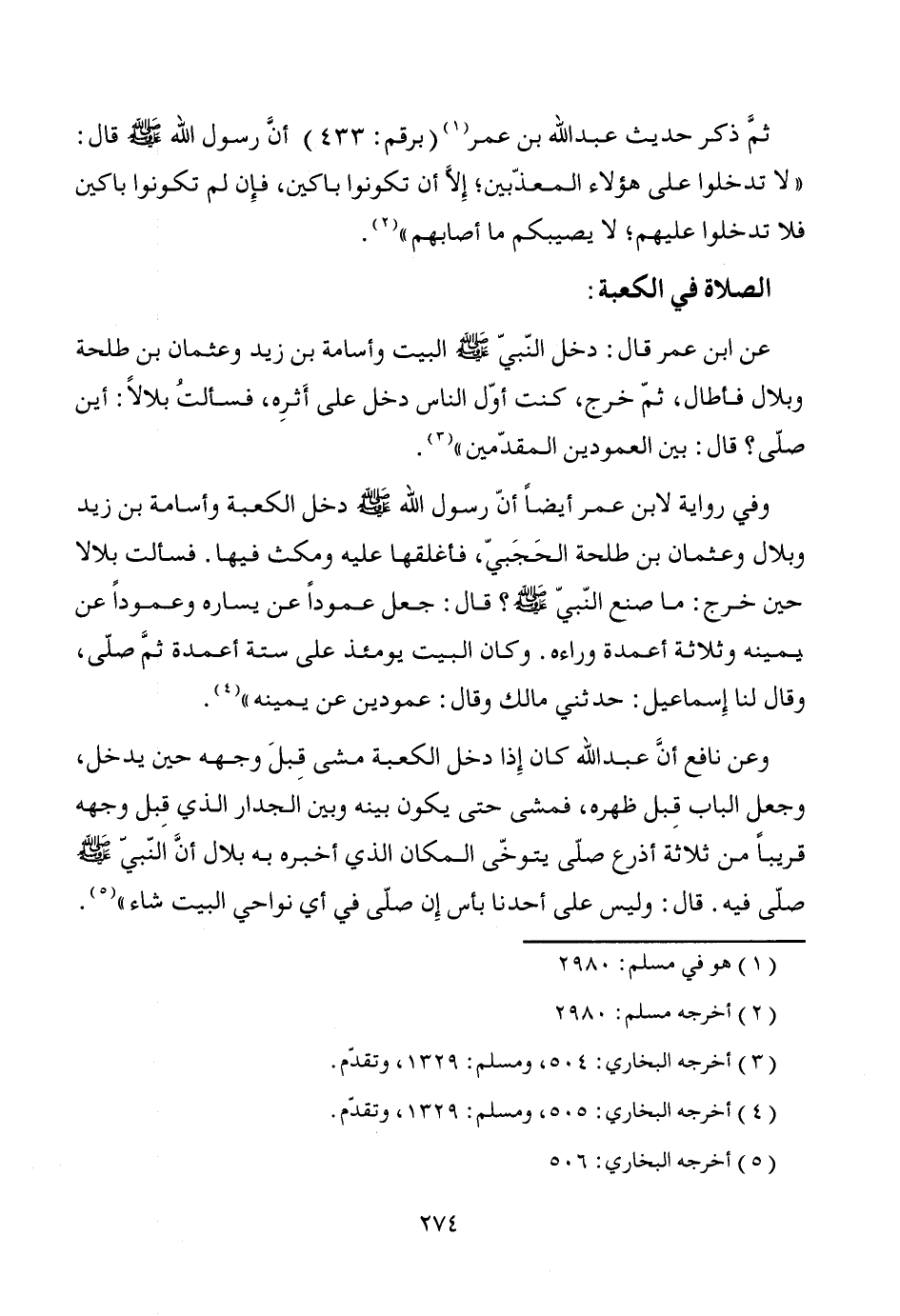عن ابن عمر قال: دخل النّبيّ - صَلَّى اللَّهُ عَلَيْهِ وَسَلَّمَ - البيت وأسامة بن زيد وعثمان بن طلحة وبلال فأطال، ثمّ خرج، كنت أوّل الناس دخل على أَثرِه، فسألتُ بلالاً: أين صلّى؟ قال: بين العمودين المقدّمين" (¬3).