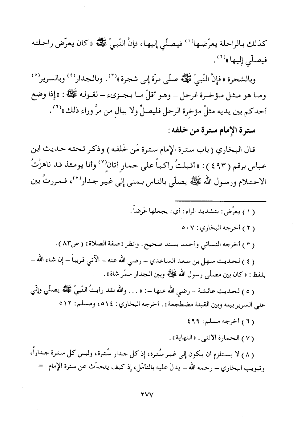 قال البخاري (باب سترة الإِمام سترة مَن خَلفه) وذكر تحته حديث ابن عباس برقم (493): "أقبلتُ راكباً على حمارٍ أتانٍ (¬7) وأنا يومئذ قد ناهزْتُ الاحتلام ورسول الله - صَلَّى اللَّهُ عَلَيْهِ وَسَلَّمَ - يصلّي بالناس بمنى إِلى غير جدار (¬8)، فمررتُ بين