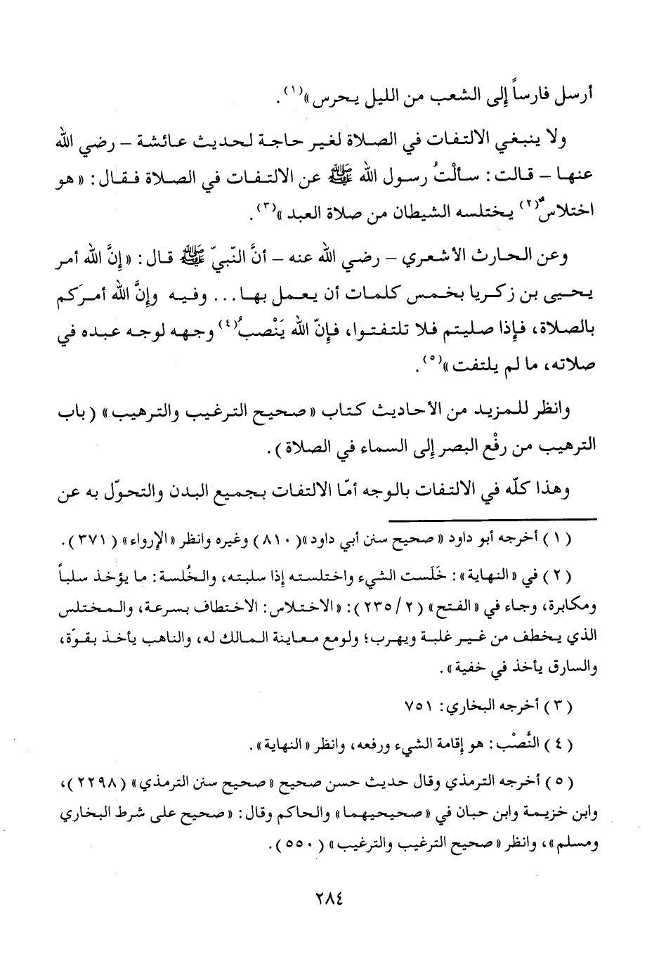 وعن الحارث الأشعري -رضي الله عنه- أنَّ النّبي - صَلَّى اللَّهُ عَلَيْهِ وَسَلَّمَ - قال: "إِنَّ الله أمر يحيى بن زكريا بخمس كلمات أن يعمل بها ... وفيه وإِنَّ الله أمرَكم بالصلاة، فإِذا صليتم فلا تلتفتوا، فإِنّ الله يَنْصبُ (¬4) وجهه لوجه عبده في صلاته، ما لم يلتفت" (¬5).