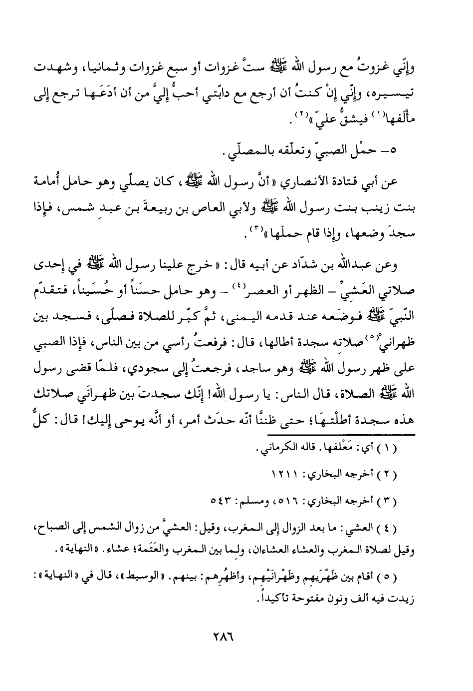 عن أبي قتادة الأنصاري "أنَّ رسول الله - صَلَّى اللَّهُ عَلَيْهِ وَسَلَّمَ -، كان يصلّي وهو حامل أُمامة بنت زينب بنت رسول الله - صَلَّى اللَّهُ عَلَيْهِ وَسَلَّمَ - ولأبي العاص بن ربيعةَ بن عبدِ شمس، فإِذا سجدَ وضعها، وإِذا قام حملَها" (¬3).