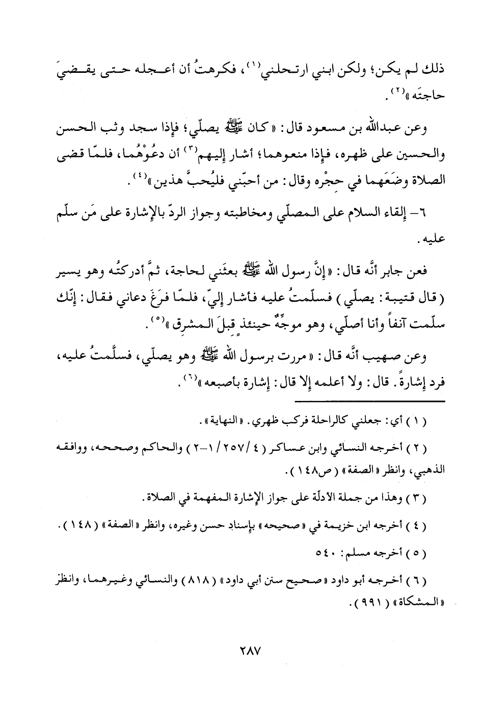 وعن صهيب أنَّه قال: "مررت برسول الله - صَلَّى اللَّهُ عَلَيْهِ وَسَلَّمَ - وهو يصلّي، فسلَّمتُ عليه، فرد إِشارةً. قال: ولا أعلمه إِلا قال: إِشارة بأصبعه" (¬6).