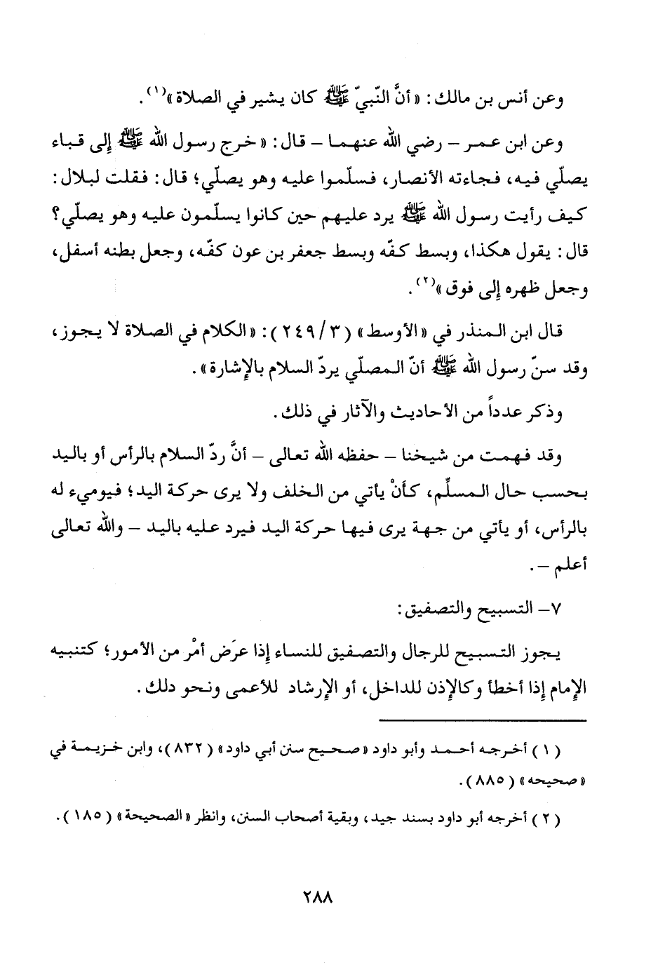قال ابن المنذر في "الأوسط" (3/ 249): "الكلام في الصلاة لا يجوز، وقد سنّ رسول الله - صَلَّى اللَّهُ عَلَيْهِ وَسَلَّمَ - أنّ المصلّي يردّ السلام بالإِشارة".
