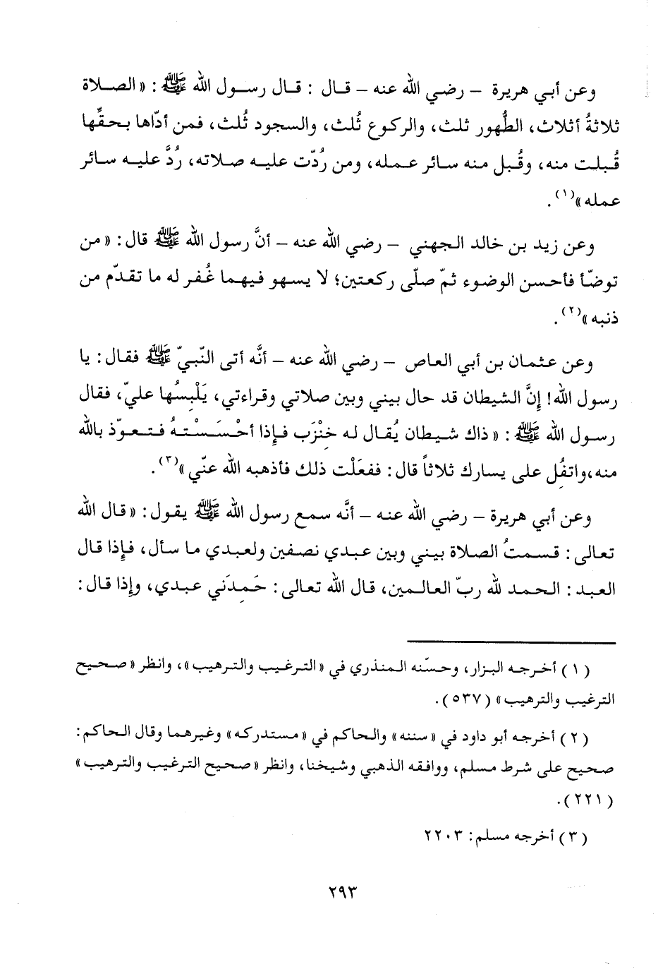 وعن أبي هريرة -رضي الله عنه- قال: قال رسول الله - صَلَّى اللَّهُ عَلَيْهِ وَسَلَّمَ -: "الصلاة ثلاثةُ أثلاث، الطُّهور ثلث، والركوع ثُلث، والسجود ثُلث، فمن أدّاها بحقِّها قُبلت منه، وقُبل منه سائر عمله، ومن رُدّت عليه صلاته، رُدَّ عليه سائر عمله" (¬1).