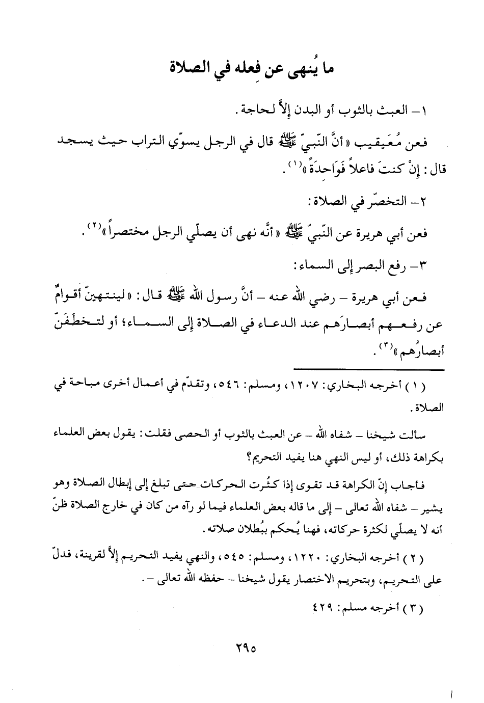 (¬2) أخرجه البخاري: 1220، ومسلم: 545، والنهي يفيد التحريم إلاَّ لقرينة، فدلّ على التحريم، وبتحريم الاختصار يقول شيخنا -حفظه الله تعالى-.