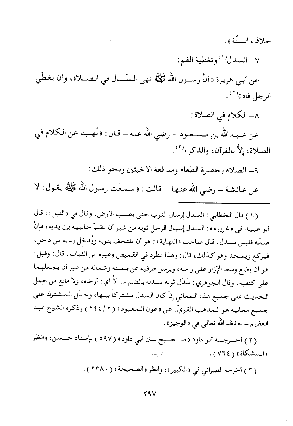 (¬1) قال الخطابي: السدل إِرسال الثوب حتى يصيب الأرض. وقال في "النيل": قال أبو عبيد في "غريبه": السدل إِسبال الرجل ثوبه من غير أن يضمّ جانبيه بين يديه، فإِنْ ضمّه فليس بسدل. قال صاحب "النهاية": هو أن يلتحف بثوبه ويُدخِل يديه من داخل، فيركع ويسجد وهو كذلك، قال: وهذا مطّرد في القميص وغيره من الثياب. قال: وقيل: هو أن يضع وسط الإِزار على رأسه، ويرسل طرفيه عن يمينه وشماله من غير أن يجعلهما على كتفيه. وقال الجوهرى: سَدَل ثوبه يسدله بالضم سدلاً أي: أرخاه، ولا مانع من حمل الحديث على جميع هذه المعاني إِنْ كان السدل مشتركاً بينها، وحمْل المشترك على جميع معانيه هو المذهب القويّ. عن "عون المعبود" (2/ 244) وذكره الشيخ عبد العظيم -حفظه الله تعالى- في "الوجيز".