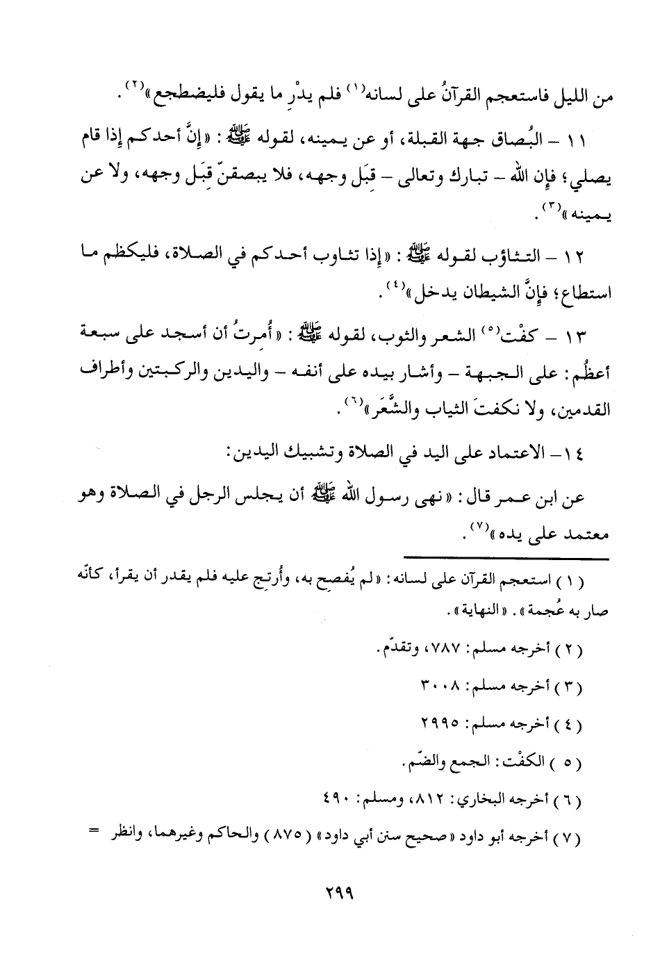 13 - كفْت (¬5) الشعر والثوب، لقوله - صَلَّى اللَّهُ عَلَيْهِ وَسَلَّمَ -: "أُمِرتُ أن أسجد على سبعة أعظُم: على الجبهة -وأشار بيده على أنفه- واليدين والركبتين وأطراف القدمين، ولا نكفتَ الثياب والشَّعَر" (¬6).