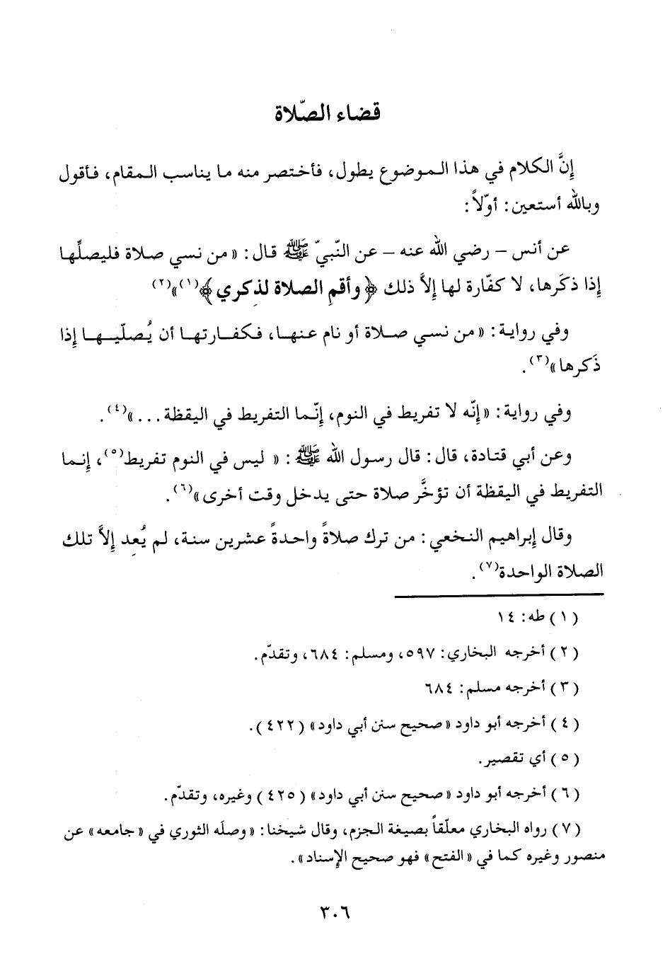 عن أنس -رضي الله عنه- عن النّبيّ - صَلَّى اللَّهُ عَلَيْهِ وَسَلَّمَ - قال: "من نسي صلاة فليصلِّها إِذا ذكَرها، لا كفّارة لها إلاَّ ذلك {وأقمِ الصلاة لذِكري} (¬1) " (¬2)
