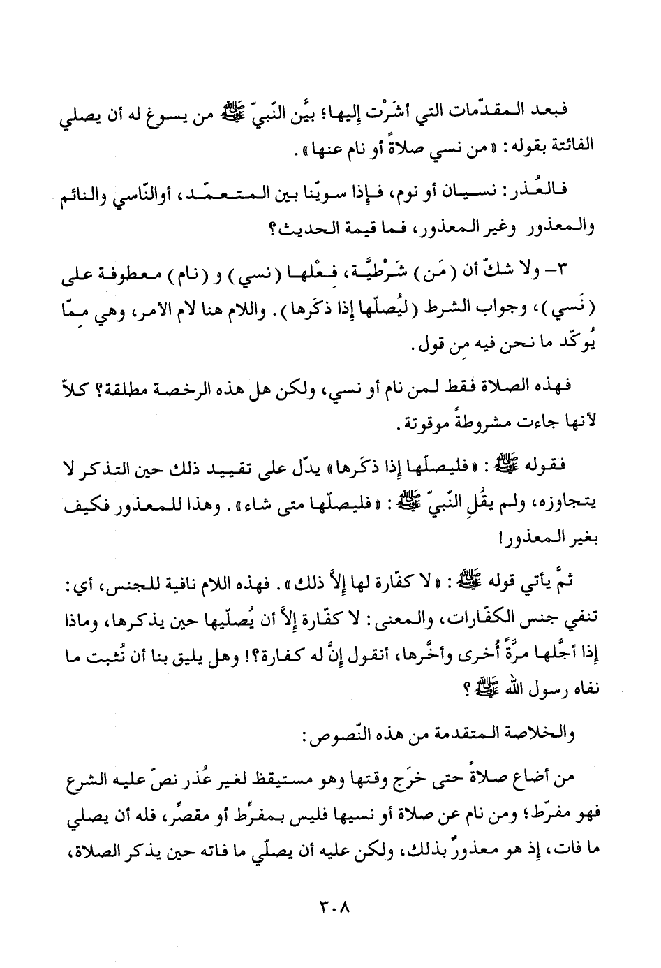 3 - ولا شكّ أن (مَن) شَرْطيَّة، فِعْلها (نسي) و (نام) معطوفة على (نَسي)، وجواب الشرط (ليُصلّها إِذا ذكَرها). واللام هنا لام الأمر، وهي ممّا يُؤكّد ما نحن فيه مِن قول.