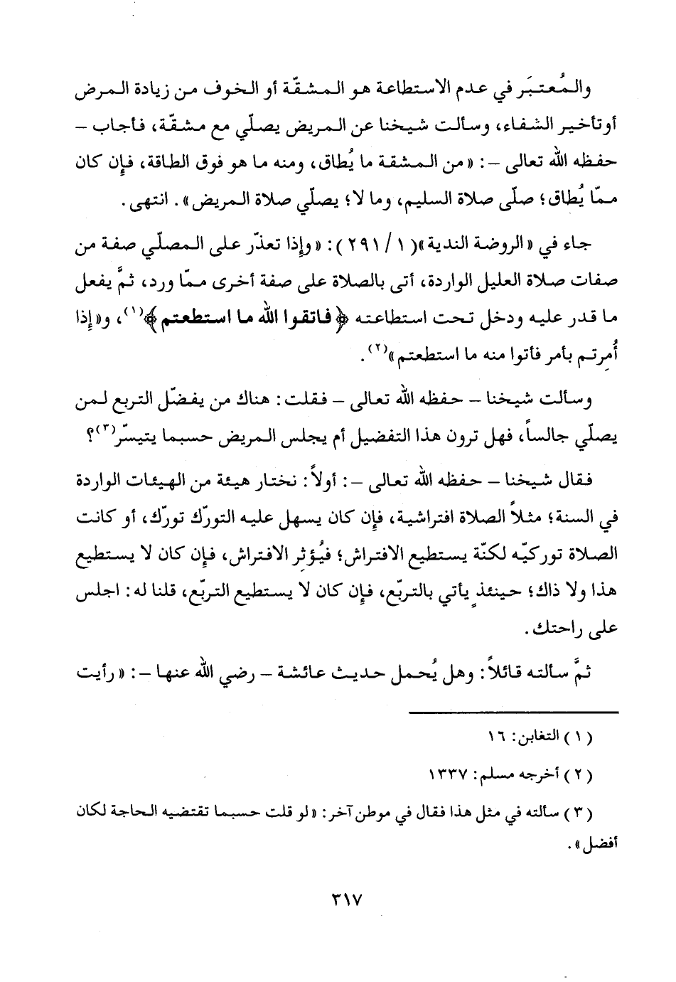 جاء في "الروضة الندية" (1/ 291): "وإذا تعذّر على المصلّي صفة من صفات صلاة العليل الواردة، أتى بالصلاة على صفة أخرى ممّا ورد، ثمَّ يفعل ما قدر عليه ودخل تحت استطاعته {فاتقوا الله ما استطعتم} (¬1)، و"إِذا أمِرتم بأمر فأتوا منه ما استطعتم" (¬2).