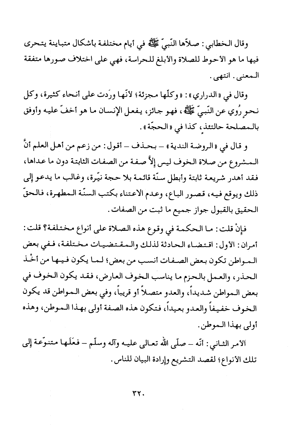 فإِنْ قلت: ما الحكمة في وقوع هذه الصلاة على أنواع مختلفة؟ قلت: أمران: الأول: اقتضاء الحادثة لذلك والمقتضيات مختلفة، ففي بعض المواطن تكون بعض الصفات أنسب من بعض؛ لما يكون فيها من أخْذ الحذر، والعمل بالحزم ما يناسب الخوف العارض، فقد يكون الخوف في بعض المواطن شديداً، والعدو متصلاً أو قريباً، وفي بعض المواطن قد يكون الخوف خفيفاً والعدو بعيداً، فتكون هذه الصفة أولى بهذا الموطن، وهذه أولى بهذا الموطن.