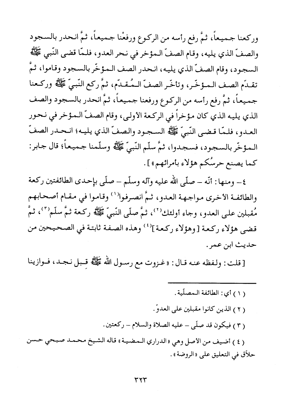 وركعنا جميعاً، ثمَّ رفع رأسه من الركوع ورفعْنا جميعاً، تمَّ انحدر بالسجود والصفّ الذي يليه، وقام الصفّ المؤخر في نحر العدو، فلمّا قضى النّبي - صَلَّى اللَّهُ عَلَيْهِ وَسَلَّمَ - السجود، وقام الصفّ الذي يليه، انحدر الصف المؤخّر بالسجود وقاموا، ثمَّ تقدّم الصف المؤخّر، وتأخّر الصفّ المُقدّم، ثمَّ ركع النّبيّ - صَلَّى اللَّهُ عَلَيْهِ وَسَلَّمَ - وركعنا جميعاً، ثمَّ رفع رأسه من الركوع ورفعنا جميعاً، ثمَّ انحدر بالسجود والصف الذي يليه الذي كان مؤخراً في الركعة الأولى، وقام الصفّ المؤخر في نحور العدو، فلمّا قضى النّبيّ - صَلَّى اللَّهُ عَلَيْهِ وَسَلَّمَ - السجود والصفّ الذي يليه؛ انحدر الصفّ المؤخّر بالسجود، فسجدوا، ثمَّ سلّم النّبيّ - صَلَّى اللَّهُ عَلَيْهِ وَسَلَّمَ - وسلّمنا جميعاً؛ قال جابر: كما يصنع حرسُكم هؤلاء بأمرائهم"].