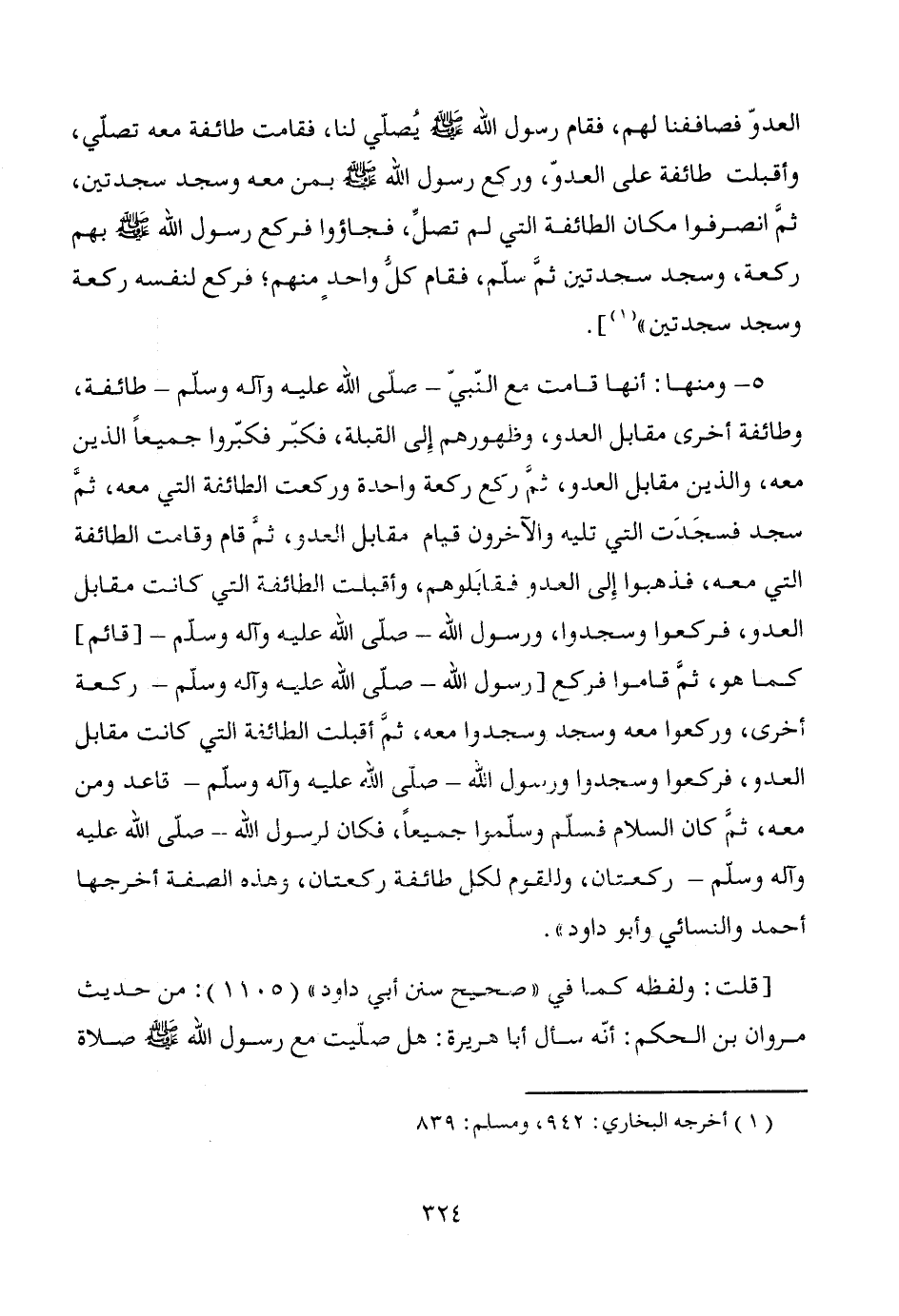 5 - ومنها: أنها قامت مع النّبيّ - صلى الله عليه وآله وسلم - طائفة، وطائفة أخرى مقابل العدو، وظهورهم إِلى القبلة، فكبّر فكبروا جميعاً الذين معه، والذين مقابل العدو، ثمَّ ركع ركعة واحدة وركعت الطائفة التي معه، ثمَّ سجد فسجدت التي تليه والآخرون قيام مقابل العدو، ثمَّ قام وقامت الطائفة التي معه، فذهبوا إِلى العدو فقابلوهم، وأقبلت الطائفة التي كانت مقابل العدو، فركعوا وسجدوا، ورسول الله - صلى الله عليه وآله وسلم -[قائم] كما هو، ثمَّ قاموا فركع [رسول الله - صلى الله عليه وآله وسلم - ركعة أخرى، وركعوا معه وسجد وسجدوا معه، ثمَّ أقبلت الطائفة التي كانت مقابل العدو، فركعوا وسجدوا ورسول الله - صلى الله عليه وآله وسلم - قاعد ومن معه، ثم كان السلام فسلم وسلموا جميعاً، فكان لرسول الله - صلى الله عليه وآله وسلم - ركعتان، وللقوم لكل طائفة ركعتان، وهذه الصفة أخرجها أحمد والنسائي وأبو داود".