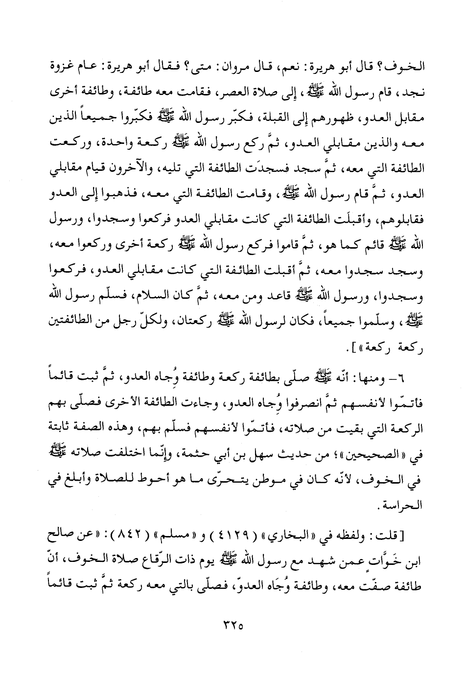 الخوف؟ قال أبو هريرة: نعم، قال مروان: متى؟ فقال أبو هريرة: عام غزوة نجد، قام رسول الله - صَلَّى اللَّهُ عَلَيْهِ وَسَلَّمَ -، إِلى صلاة العصر، فقامت معه طائفة، وطائفة أخرى مقابل العدو، ظهورهم إِلى القبلة، فكبّر رسول الله - صَلَّى اللَّهُ عَلَيْهِ وَسَلَّمَ - فكبّروا جميعاً الذين معه والذين مقابلي العدو، ثمَّ ركع رسول الله - صَلَّى اللَّهُ عَلَيْهِ وَسَلَّمَ - ركعة واحدة، وركعت الطائفة التي معه، ثمَّ سجد فسجدَت الطائفة التي تليه، والآخرون قيام مقابلي العدو، ثمَّ قام رسول الله - صَلَّى اللَّهُ عَلَيْهِ وَسَلَّمَ -، وقامت الطائفة التي معه، فذهبوا إِلى العدو فقابلوهم، وأقبلَت الطائفة التي كانت مقابلي العدو فركعوا وسجدوا، ورسول الله - صَلَّى اللَّهُ عَلَيْهِ وَسَلَّمَ - قائم كما هو، ثمَّ قاموا فركع رسول الله - صَلَّى اللَّهُ عَلَيْهِ وَسَلَّمَ - ركعة أخرى وركعوا معه، وسجد سجدوا معه، ثمَّ أقبلت الطائفة التي كانت مقابلي العدو، فركعوا وسجدوا، ورسول الله - صَلَّى اللَّهُ عَلَيْهِ وَسَلَّمَ - قاعد ومن معه، ثمَّ كان السلام، فسلّم رسول الله - صَلَّى اللَّهُ عَلَيْهِ وَسَلَّمَ - وسلّموا جميعاً، فكان لرسول الله - صَلَّى اللَّهُ عَلَيْهِ وَسَلَّمَ - ركعتان، ولكلّ رجل من الطائفتين ركعة ركعة"].