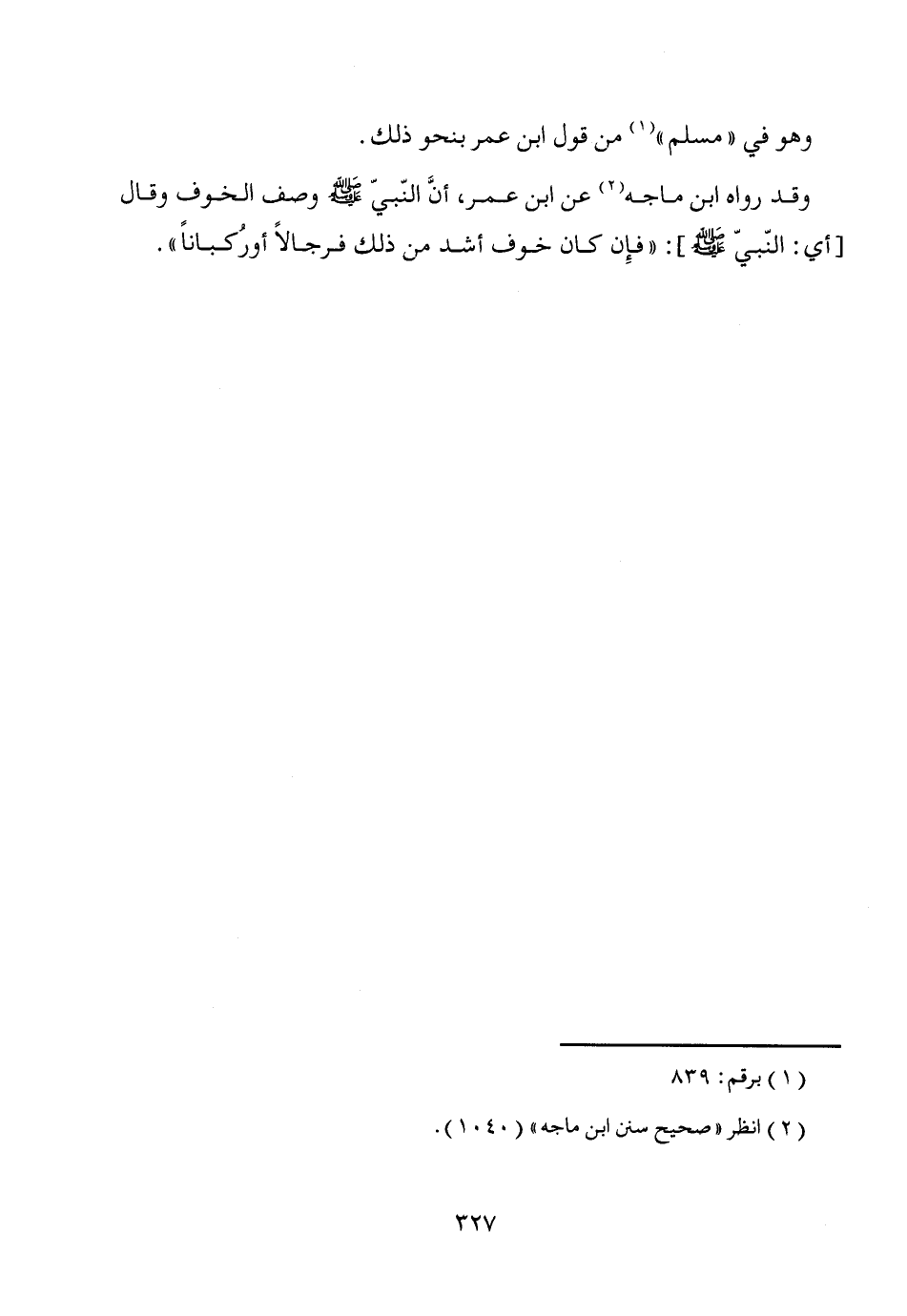 وقد رواه ابن ماجه (¬2) عن ابن عمر، أنَّ النّبيّ - صَلَّى اللَّهُ عَلَيْهِ وَسَلَّمَ - وصف الخوف وقال [أي: النّبيّ - صَلَّى اللَّهُ عَلَيْهِ وَسَلَّمَ -]: "فإِن كان خوف أشد من ذلك فرجالاً أو رُكباناً".