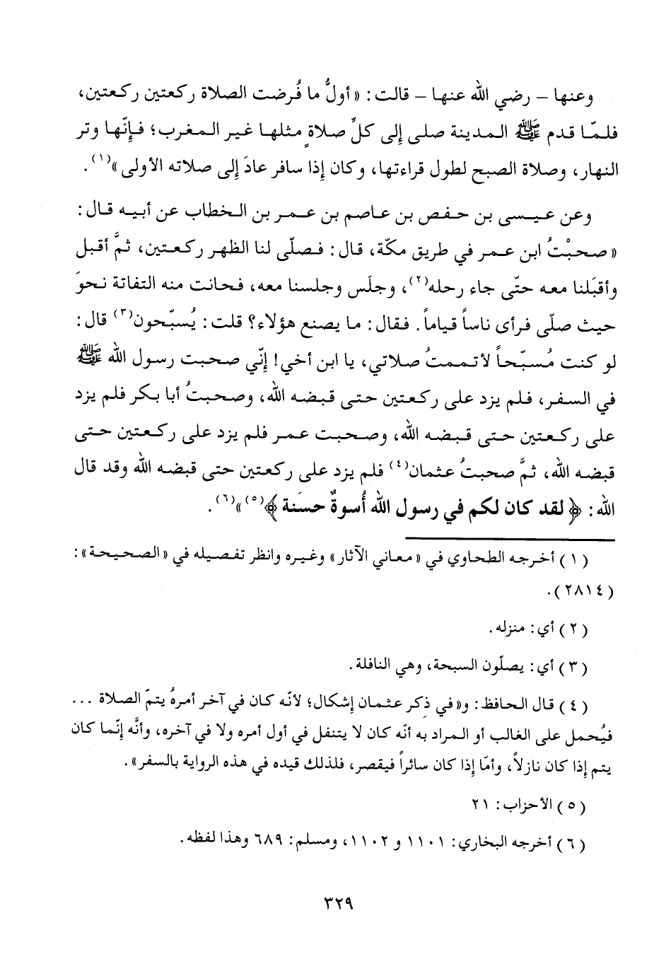 وعن عيسى بن حفص بن عاصم بن عمر بن الخطاب عن أبيه قال: "صحبْتُ ابن عمر في طريق مكّة، قال: فصلّى لنا الظهر ركعتين، ثمَّ أقبل وأقبَلنا معه حتّى جاء رحله (¬2)، وجلَس وجلسنا معه، فحانت منه التفاتة نحوَ حيث صلّى فرأى ناساً قياماً. فقال: ما يصنع هؤلاء؟ قلت: يُسبّحون (¬3) قال: لو كنت مُسبّحاً لأتممتُ صلاتي، يا ابن أخي! إِنّي صحبت رسول الله - صَلَّى اللَّهُ عَلَيْهِ وَسَلَّمَ - في السفر، فلم يزد على ركعتين حتى قبضه الله، وصحبتُ أبا بكر فلم يزد على ركعتين حتى قبضه الله، وصحبت عمر فلم يزد على ركعتين حتى قبضه الله، ثمَّ صحبتُ عثمان (¬4) فلم يزد على ركعتين حتى قبضه الله وقد قال الله: {لقد كان لكم في رسول الله أُسوةٌ حسَنة} (¬5) " (¬6).