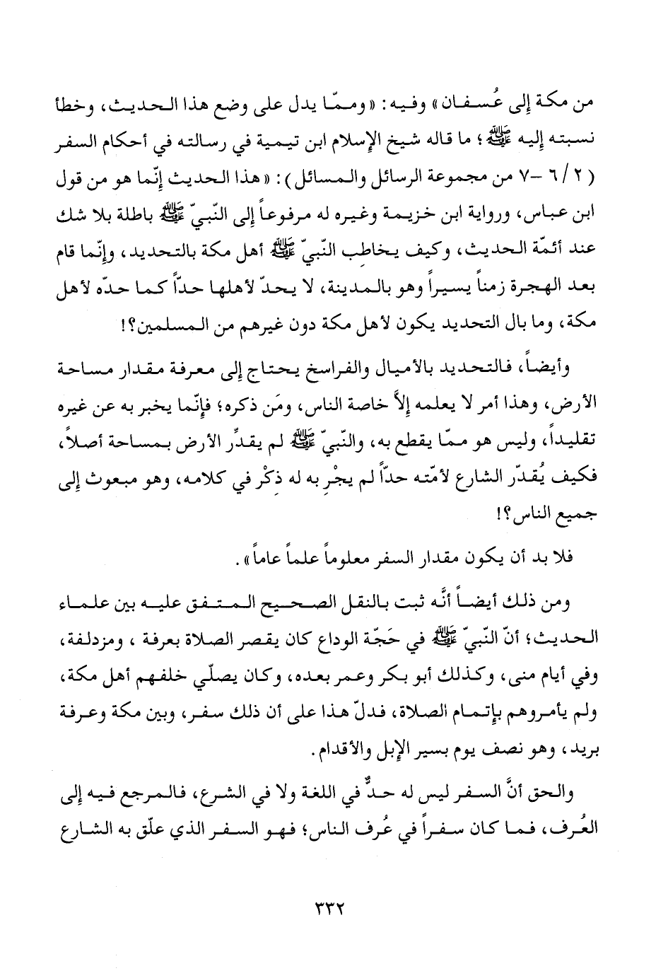 من مكة إِلى عُسفان" وفيه: "وممّا يدل على وضع هذا الحديث، وخطأ نسبته إِليه - صَلَّى اللَّهُ عَلَيْهِ وَسَلَّمَ -؛ ما قاله شيخ الإِسلام ابن تيمية في رسالته في أحكام السفر (2/ 6 - 7 من مجموعة الرسائل والمسائل): "هذا الحديث إِنّما هو من قول ابن عباس، ورواية ابن خزيمة وغيره له مرفوعاً إِلى النّبيّ - صَلَّى اللَّهُ عَلَيْهِ وَسَلَّمَ - باطلة بلا شك عند أئمّة الحديث، وكيف يخاطِب النّبيّ - صَلَّى اللَّهُ عَلَيْهِ وَسَلَّمَ - أهل مكة بالتحديد، وإِنّما قام بعد الهجرة زمناً يسيراً وهو بالمدينة، لا يحدّ لأهلها حدّاً كما حدّه لأهل مكة، وما بال التحديد يكون لأهل مكة دون غيرهم من المسلمين؟!