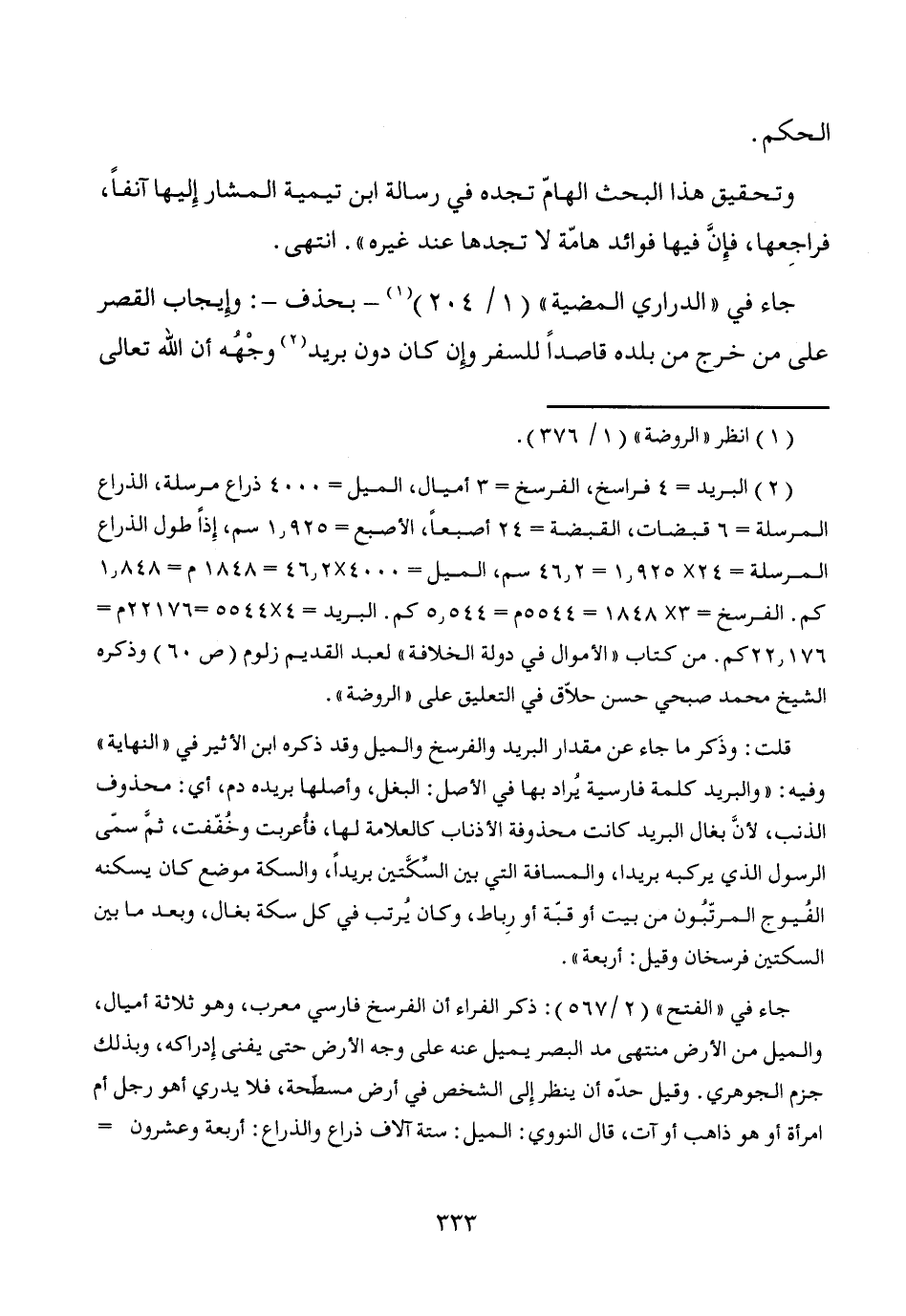 (¬2) البريد = 4 فراسخ، الفرسخ = 3 أميال، الميل = 4000 ذراع مرسلة، الذراع المرسلة = 6 قبضات، القبضة = 24 أصبعاً، الأصبع = 1.925 سم، إِذاً طول الذراع المرسلة = 24×1.925 = 46.2 سم، الميل = 4000×46.2 = 1848 م = 1.848 كم. الفرسخ = 3×1848 = 5544 م = 5.544 كم. البريد = 4×5544 = 22176 م = 22.176 كم. من كتاب "الأموال في دولة الخلافة" لعبد القديم زلوم (ص 60) وذكره الشيخ محمد صبحي حسن حلاّق في التعليق على "الروضة".